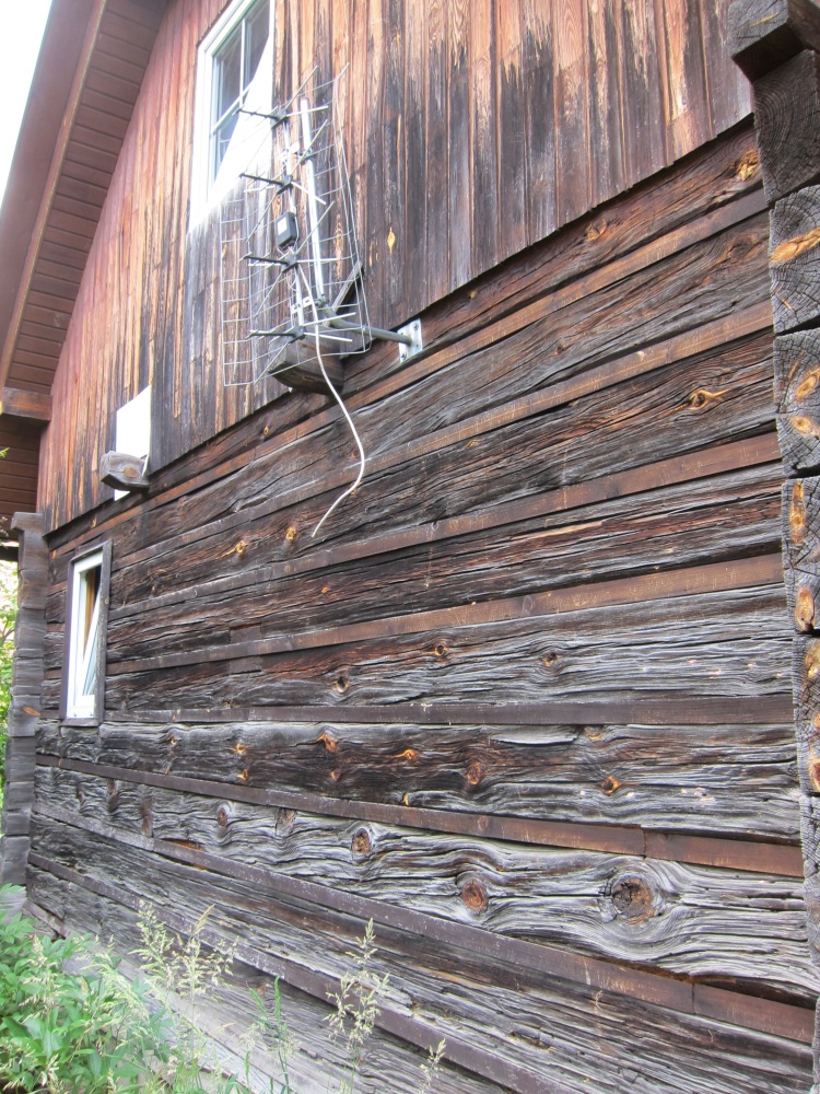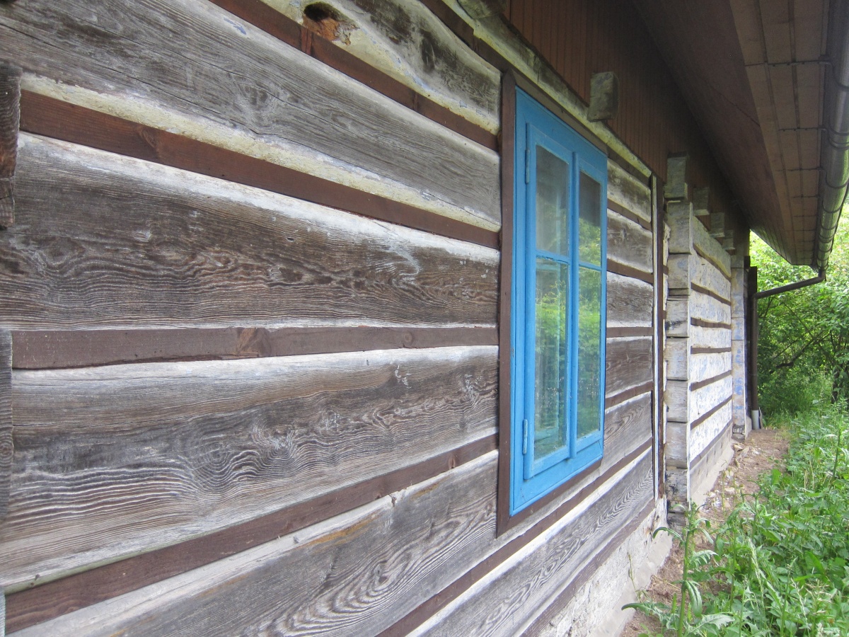 Odnowiona chata wiejska z bali drewnianych z budynkami gospodarczymi, siedlisko