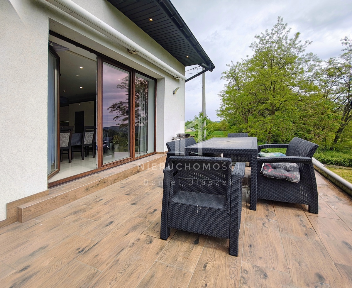 - przestronny salon z kominkiem połączony z jadalnią oraz wyjściem na duży taras wzbogacony o markizę elektryczną – zapewniającą przyjemny cień latem, z którego rozpościera się widok na porośnięte lasami pagórki i stawy u ich podnóża,