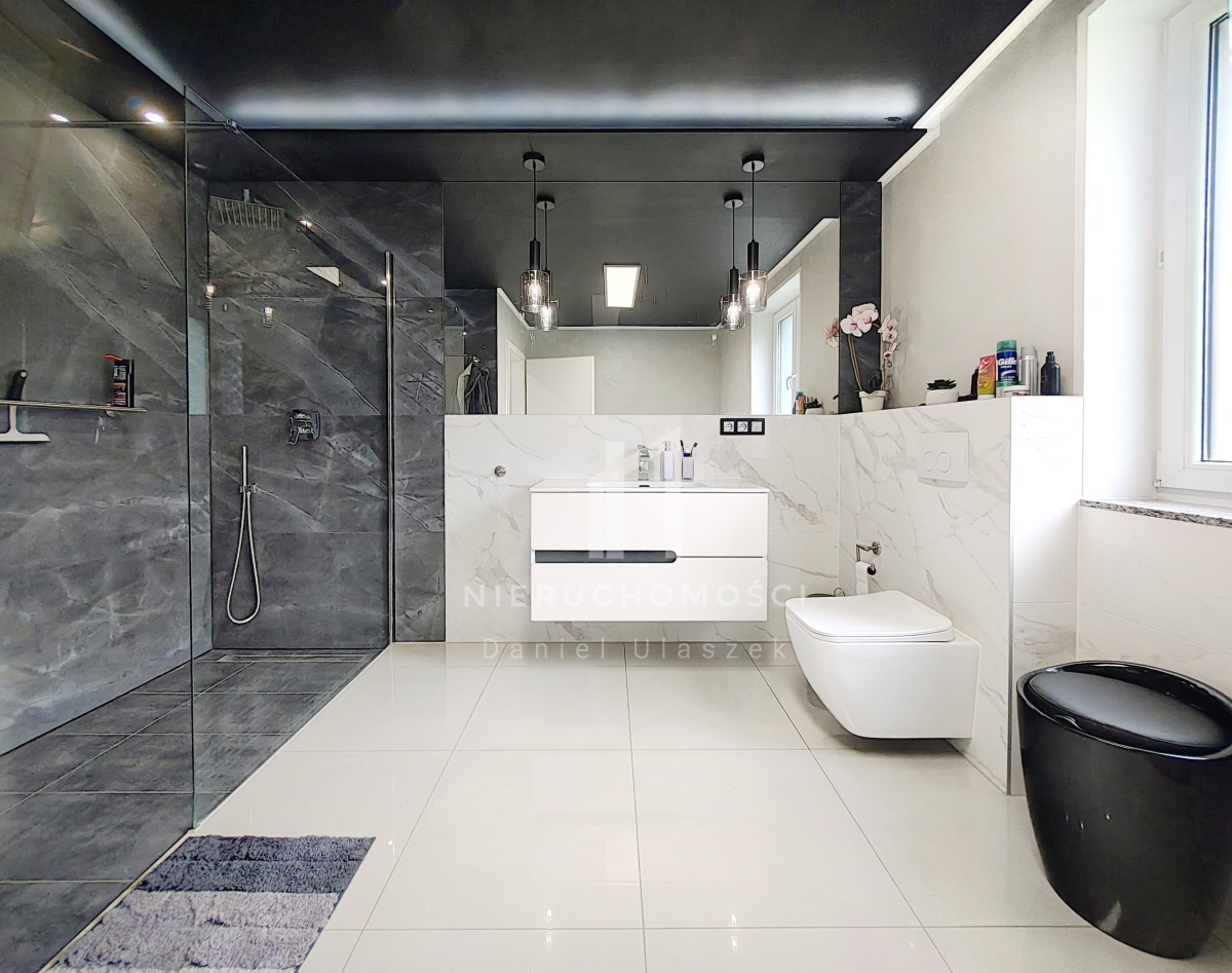 - duża, elegancka łazienka, z prysznicem i wanną, wykończona w nowoczesny designie,