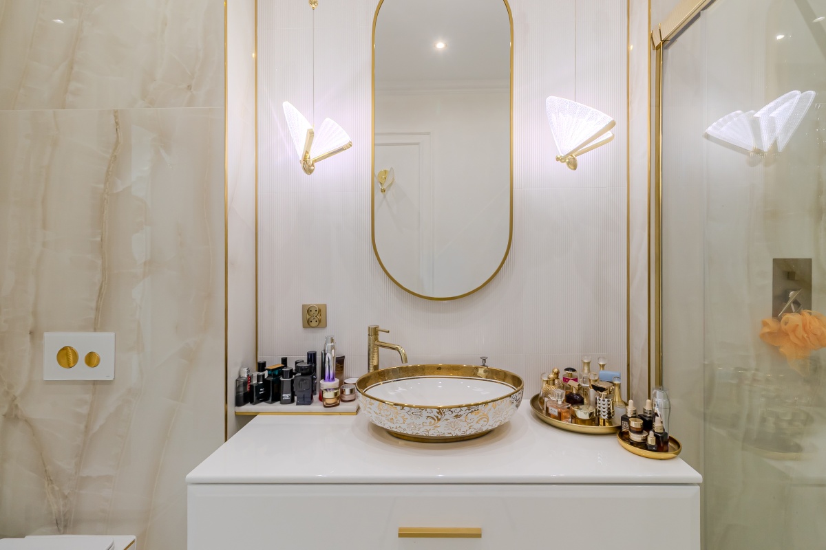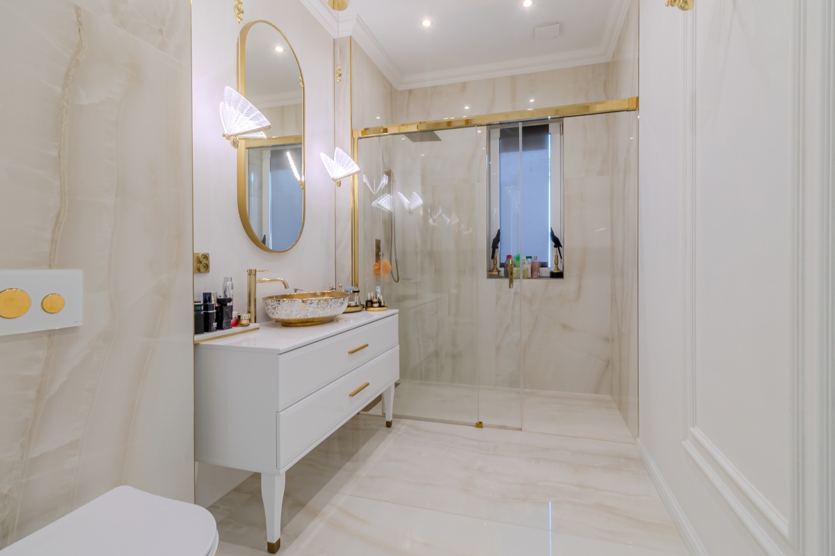 - jasna nowoczesna łazienka z niespotykanym wyposażeniem, w harmonijnym połączeniu bieli i złota