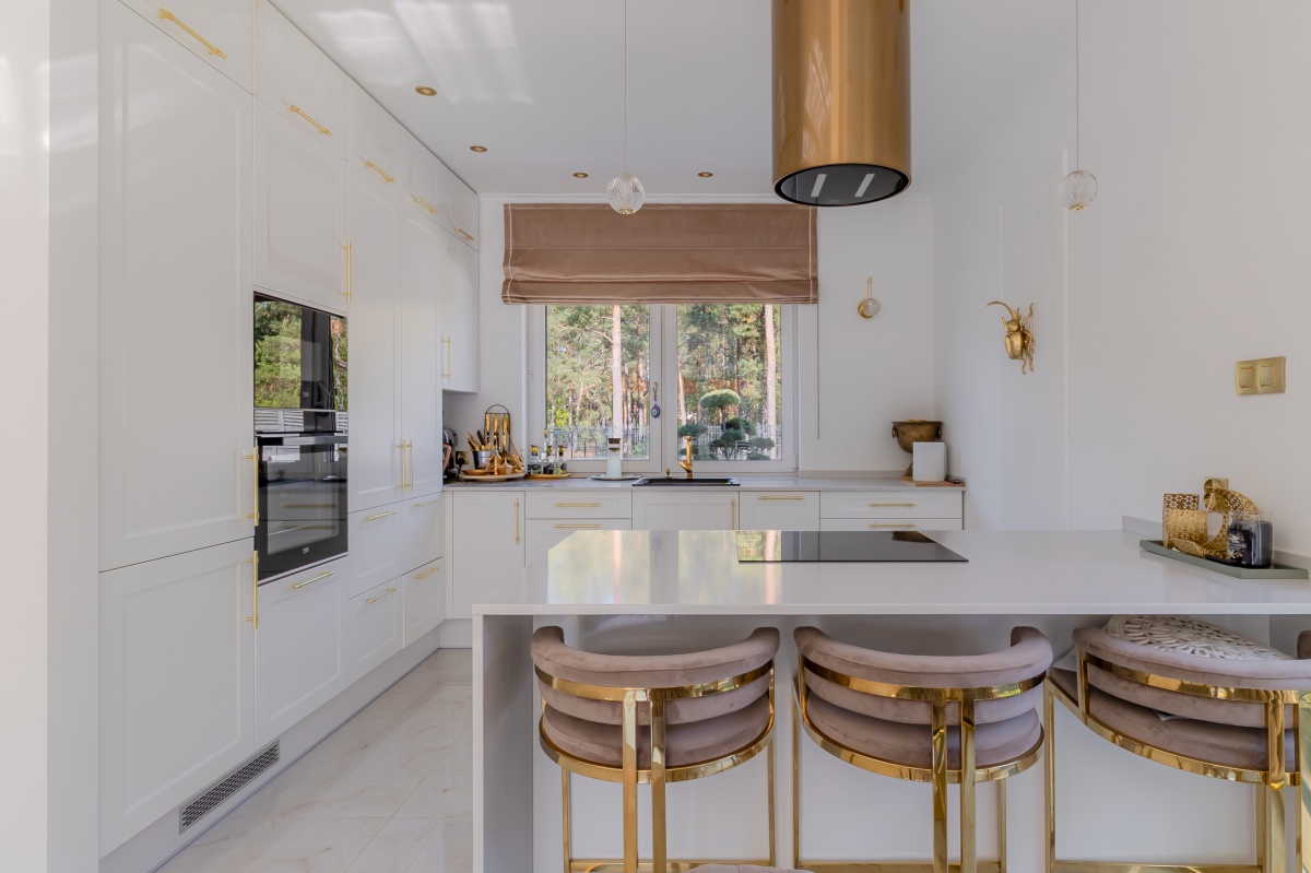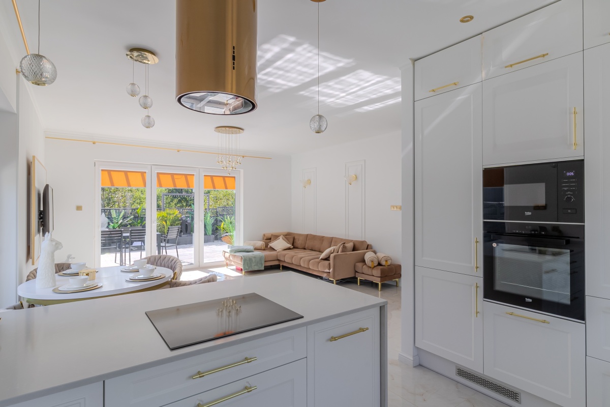 - elegancki aneks kuchenny z zabudową na wymiar i nowoczesnym sprzętem AGD nadaje luksusowego charakteru w połączeniu z jadalnią z designerskimi meblami i oświetleniem,