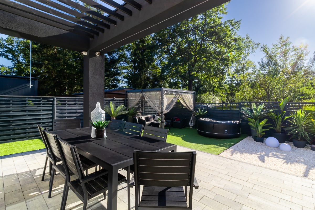 - zaaranżowany taras sprzyjający spotkaniom i spokojnym chwilom w otoczeniu zieleni.