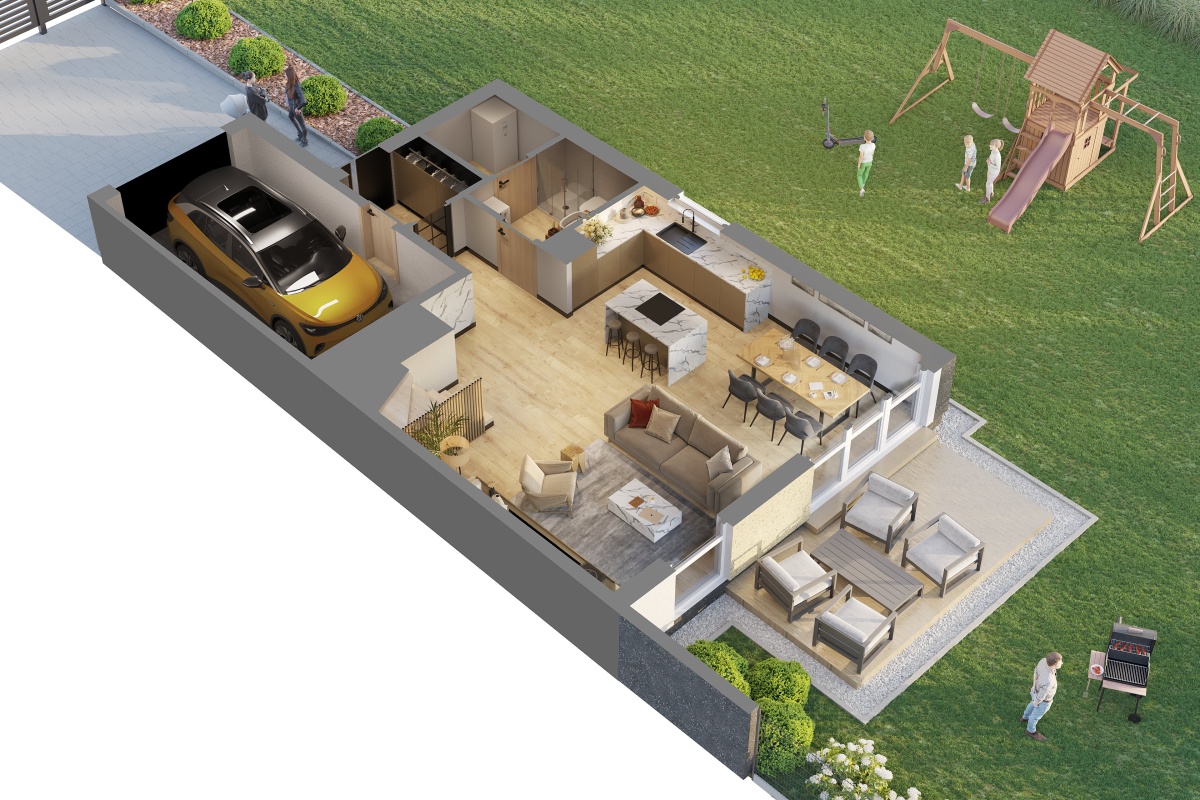 garaż (17,5 m²) z bezpośrednim przejściem do domu - praktyczny w codziennym użytkowaniu.