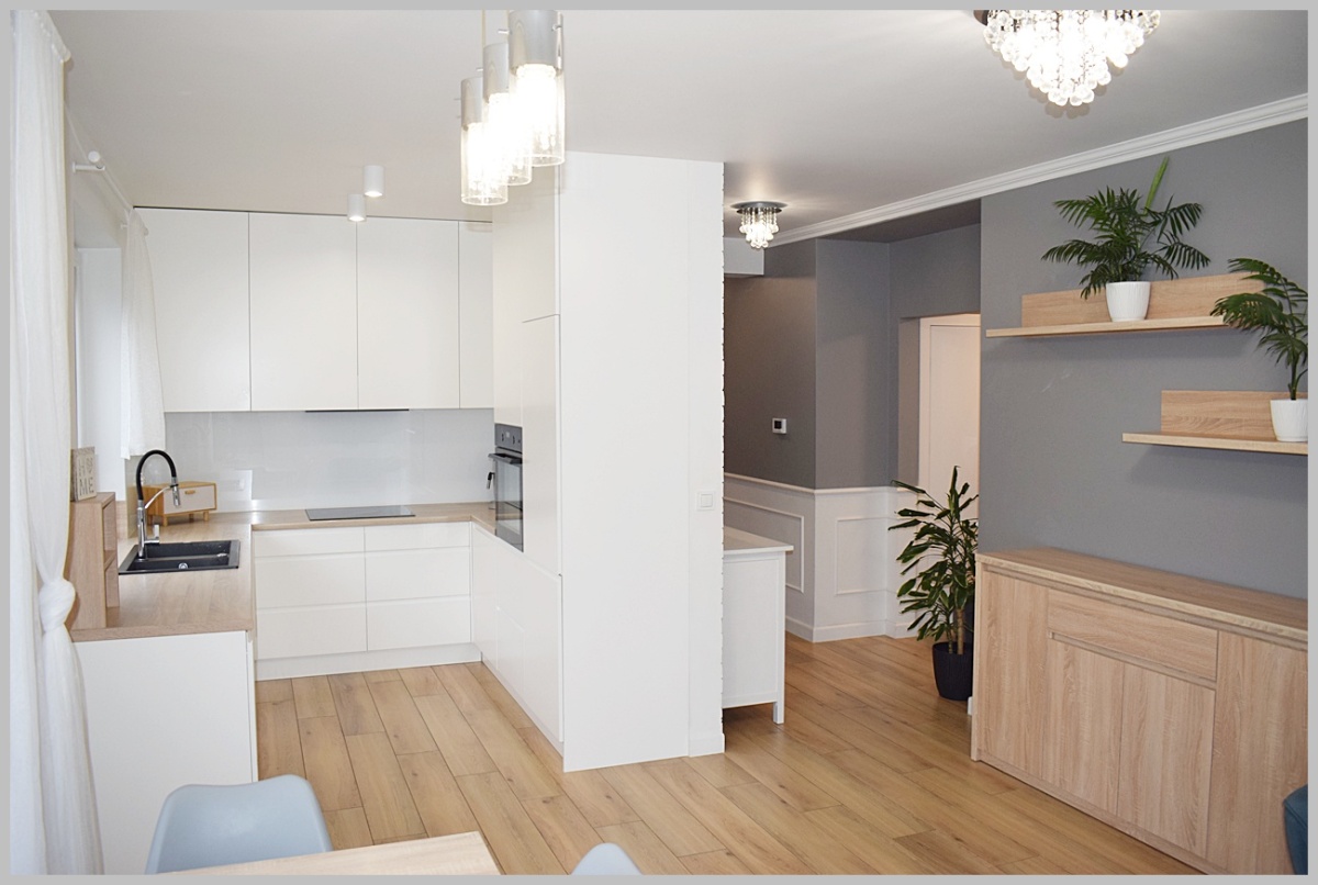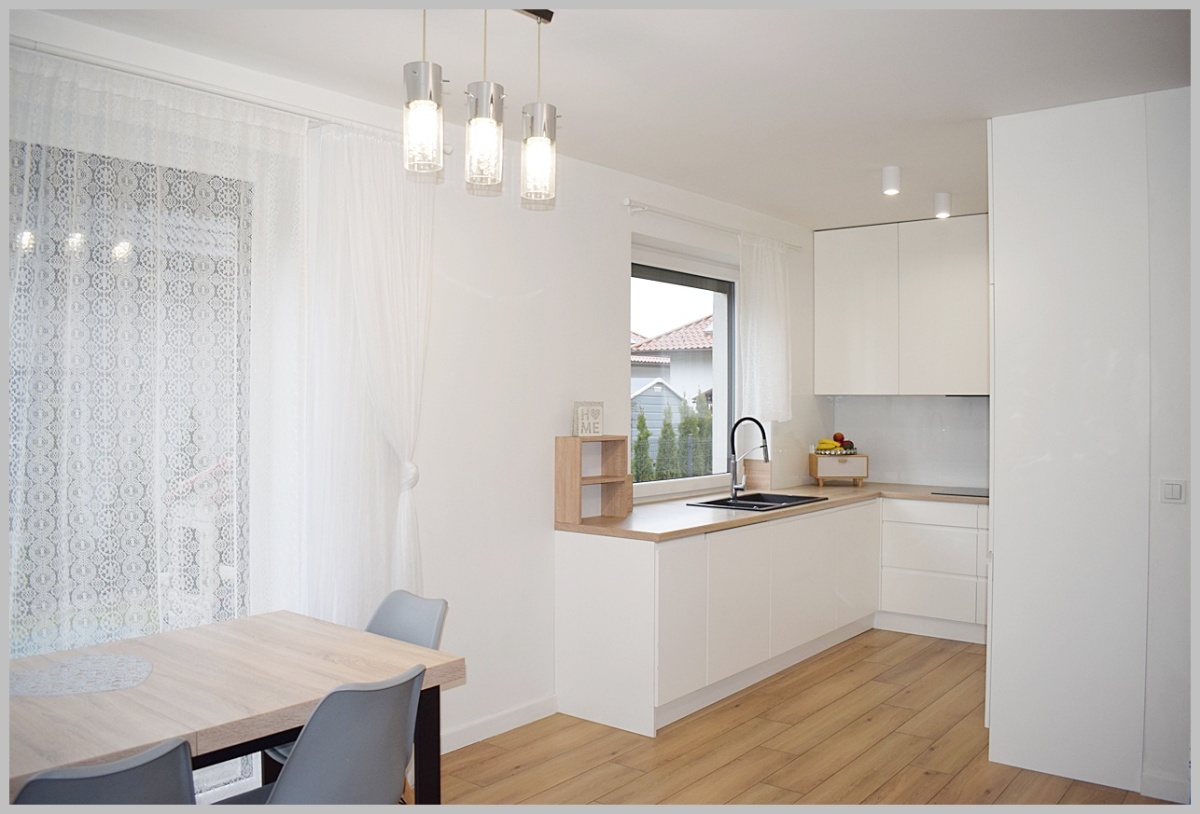 Kuchnia zabudowana wraz ze sprzętem AGD: piekarnik elektryczny, płyta grzewcza indukcyjna- ELECTROLUX, lodówko-zamrażarka - SAMSUNG, zmywarka- SIEMENS, okap.