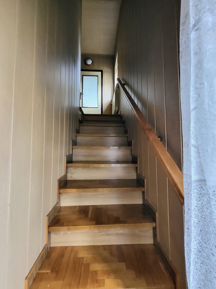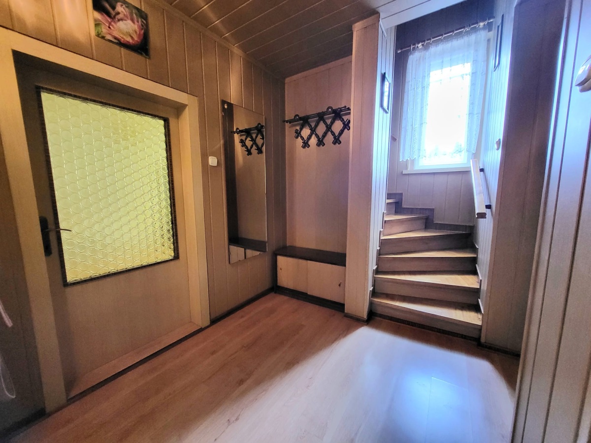 Na górze znajdują się dwa pokoje, kuchnia i łazienka.