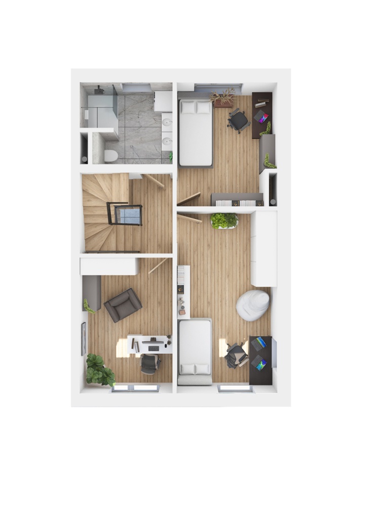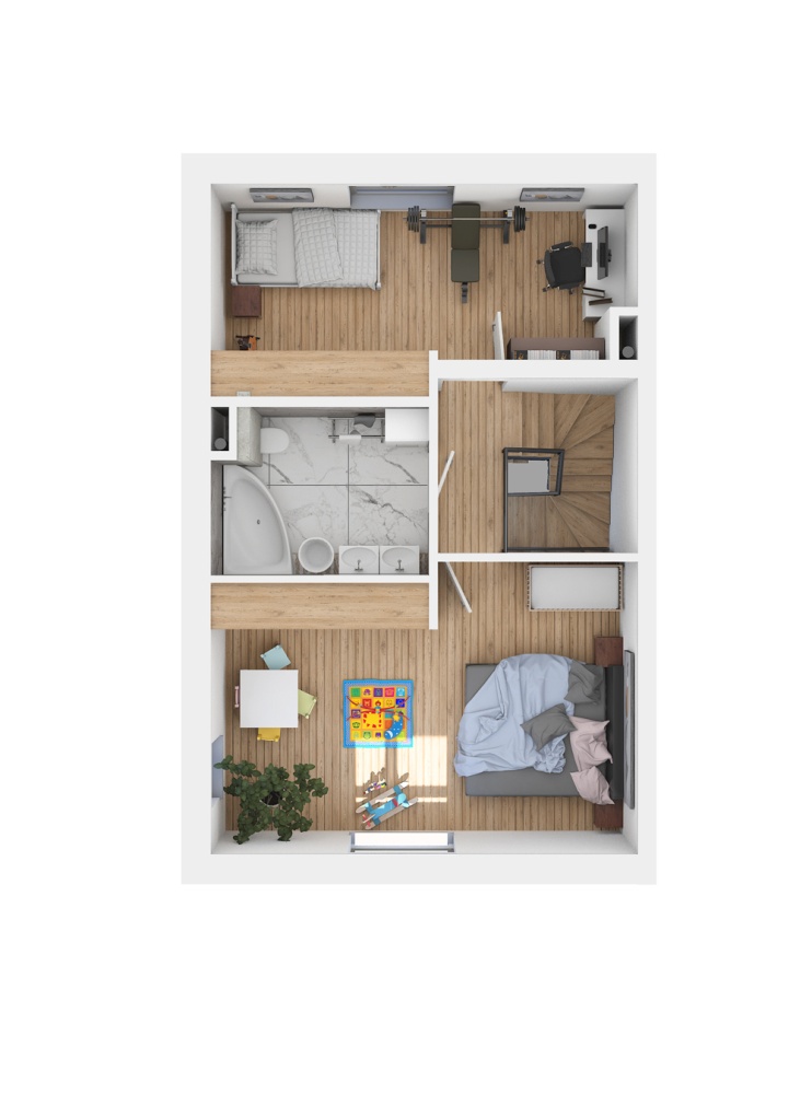 - I piętro: trzy sypialnie i łazienka.