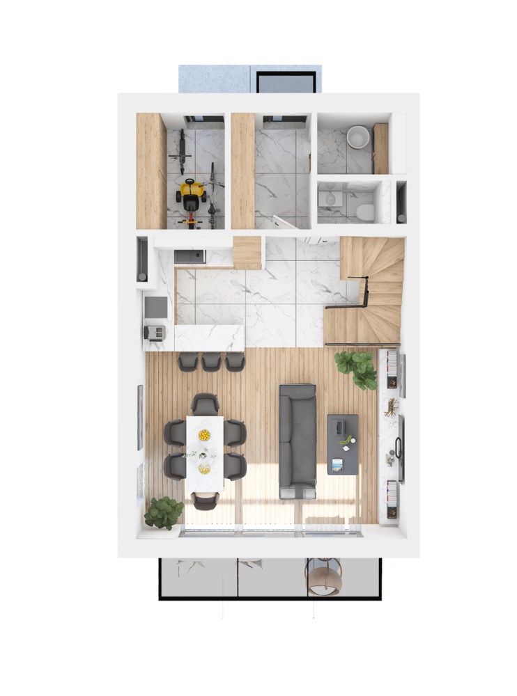 - Parter: przestronny salon z aneksem kuchennym i wyjściem na ogród, pomieszczenia gospodarcze i techniczne.