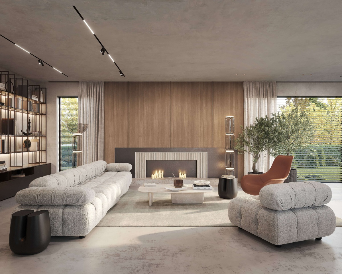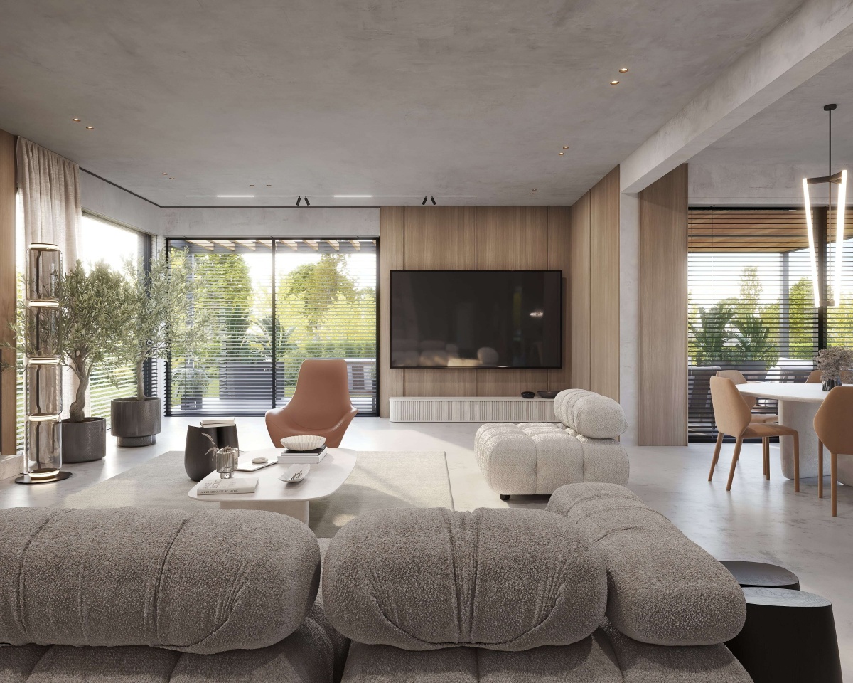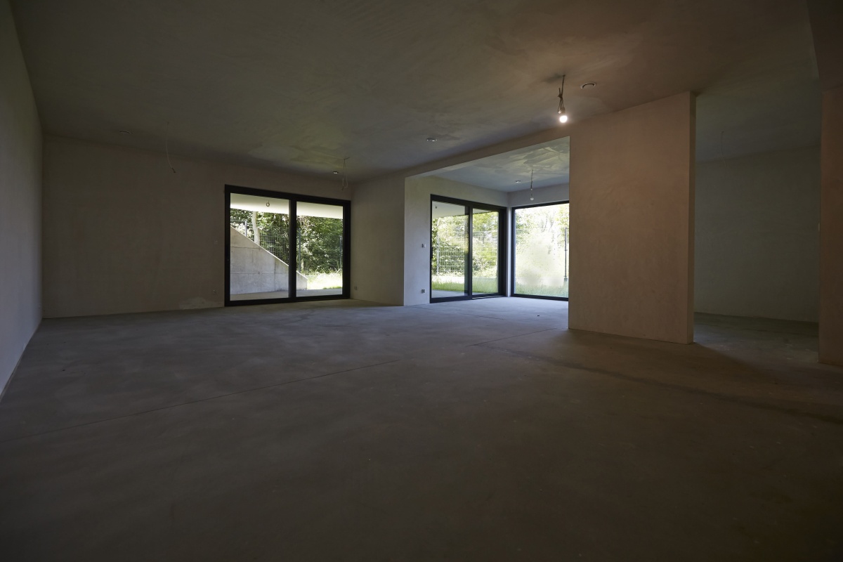 • reprezentacyjny salon z wysokimi, aluminiowymi przeszkleniami i wyjściem do ogrodu,