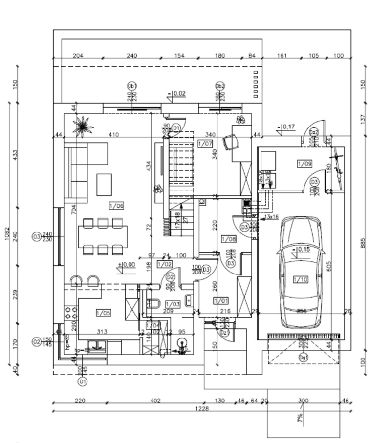 brama garażowa segmentowa sterowana pilotem, napęd Bennica. Okna 3 szybowe, ciepła ramka dla szyb, profil okienny 81mm;7komorowe;3uszczelki ; Uw<0,8W/m2K; Ciepły montaż okien na taśmy rozprężne + ciepły parapet. Drzwi wejściowe i ogrodowe marki Wikęd.