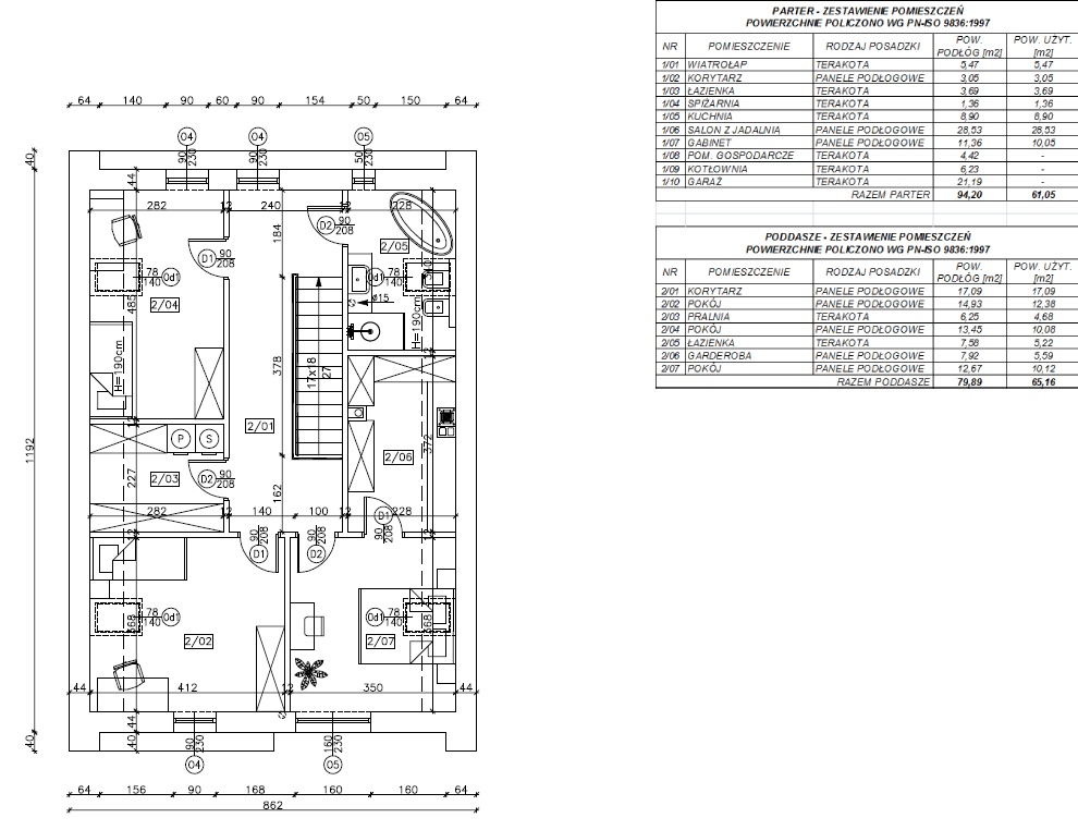 ściany nośne wymurowane z betonu komórkowego h+h gr.24cm. Trzpienie konstrukcyjne, schody oraz strop nad parterem wykonane w technologii żelbetowej monolitycznej z betonu C20/25. Ocieplenie ścian zewnętrznych to 20cm styropian grafitowy (lambda 0,31W/mK) + elewacja zewnętrzna wykonana produktami marki Mapei.