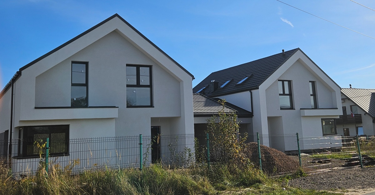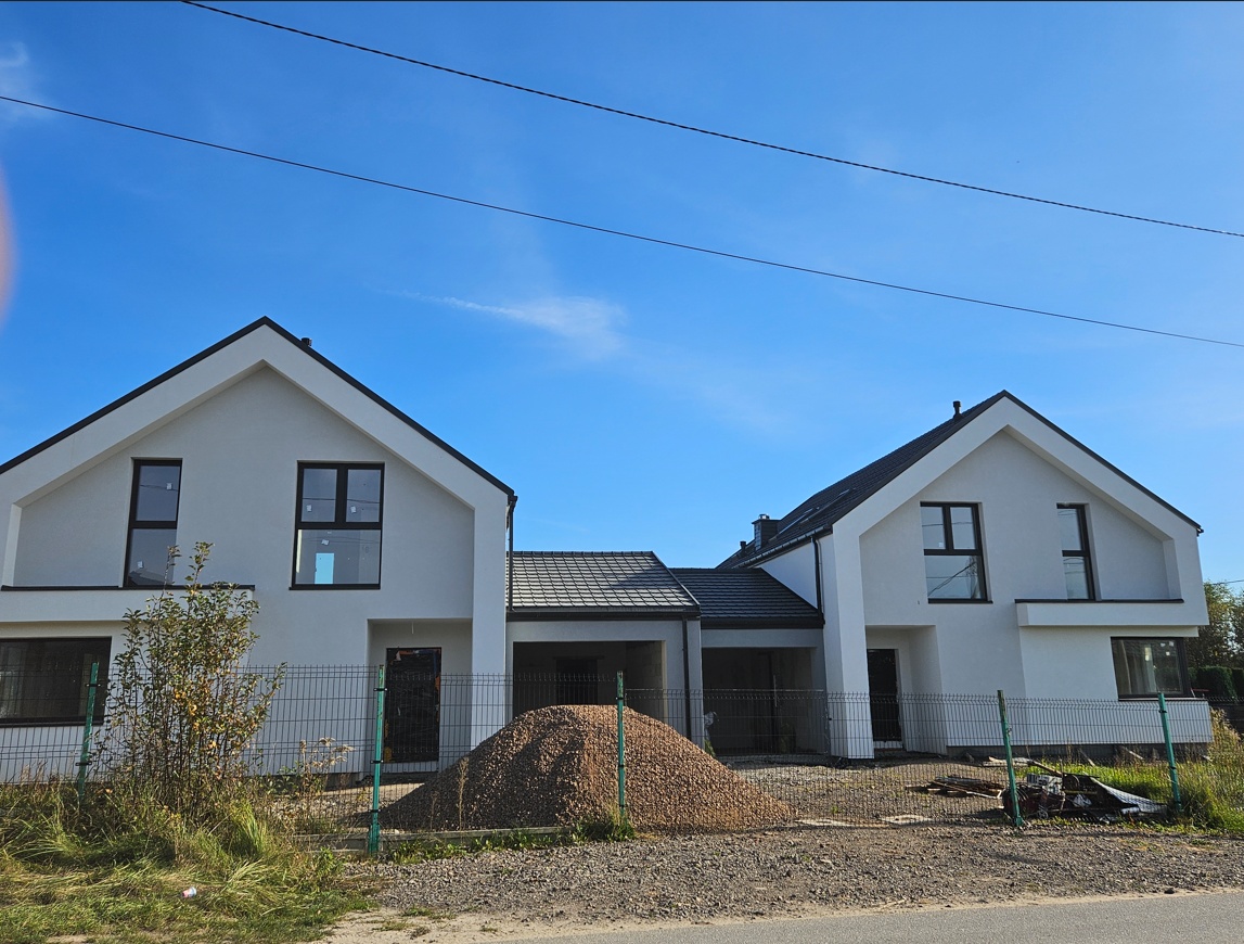 wszystkie działki wydzielone ogrodzeniem panelowym, natomiast od frontu aluminiowa brama wjazdowa furtka z. Podjazd i opaska wokół domu będą utwardzone, natomiast teren zielony wyrównany i zagospodarowany pod przyszły trawnik.
