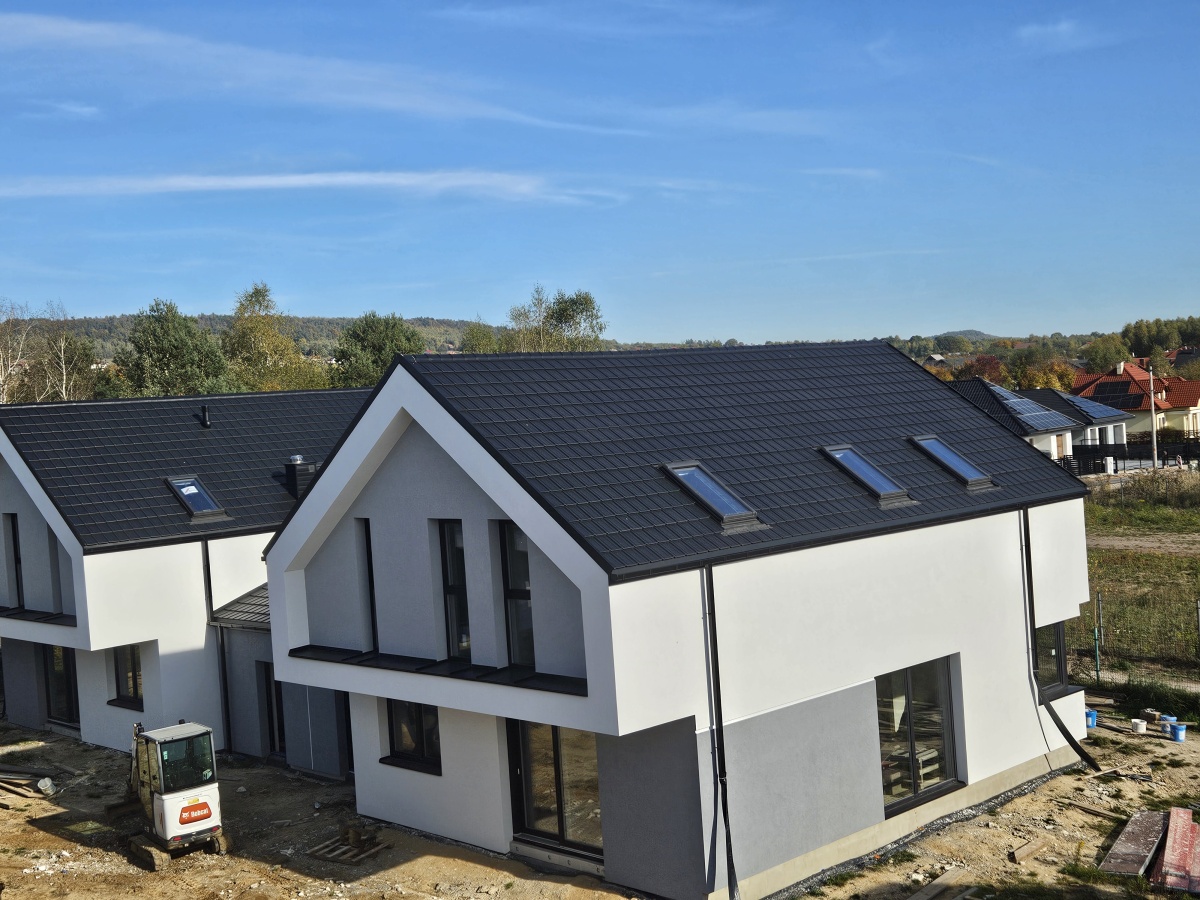 izolacja dachu to 25cm wełny mineralnej. Poszycie wykonane z blachodachówki marki Budmat.