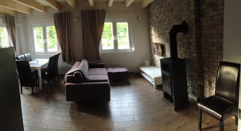 Salon z aneksem kuchennym – przestronny i wyposażony w niezbędne sprzęty oraz stół, gdzie można wspólnie zjeść posiłek.