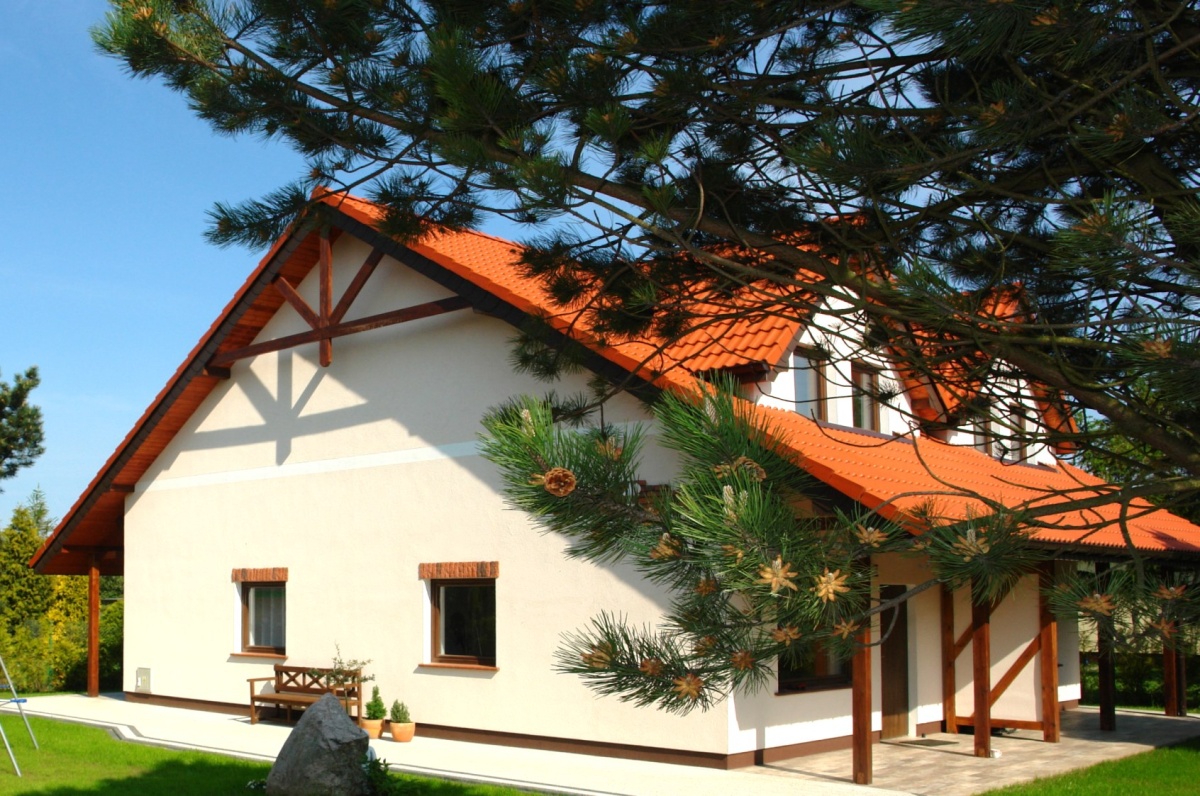 Dom murowany z suporeksu 24 cm, ocieplenie: styropian szary , dach z dachówki cementowej BRASSA izolowany wełną ROCKWOOL , okna PCV brązowe.