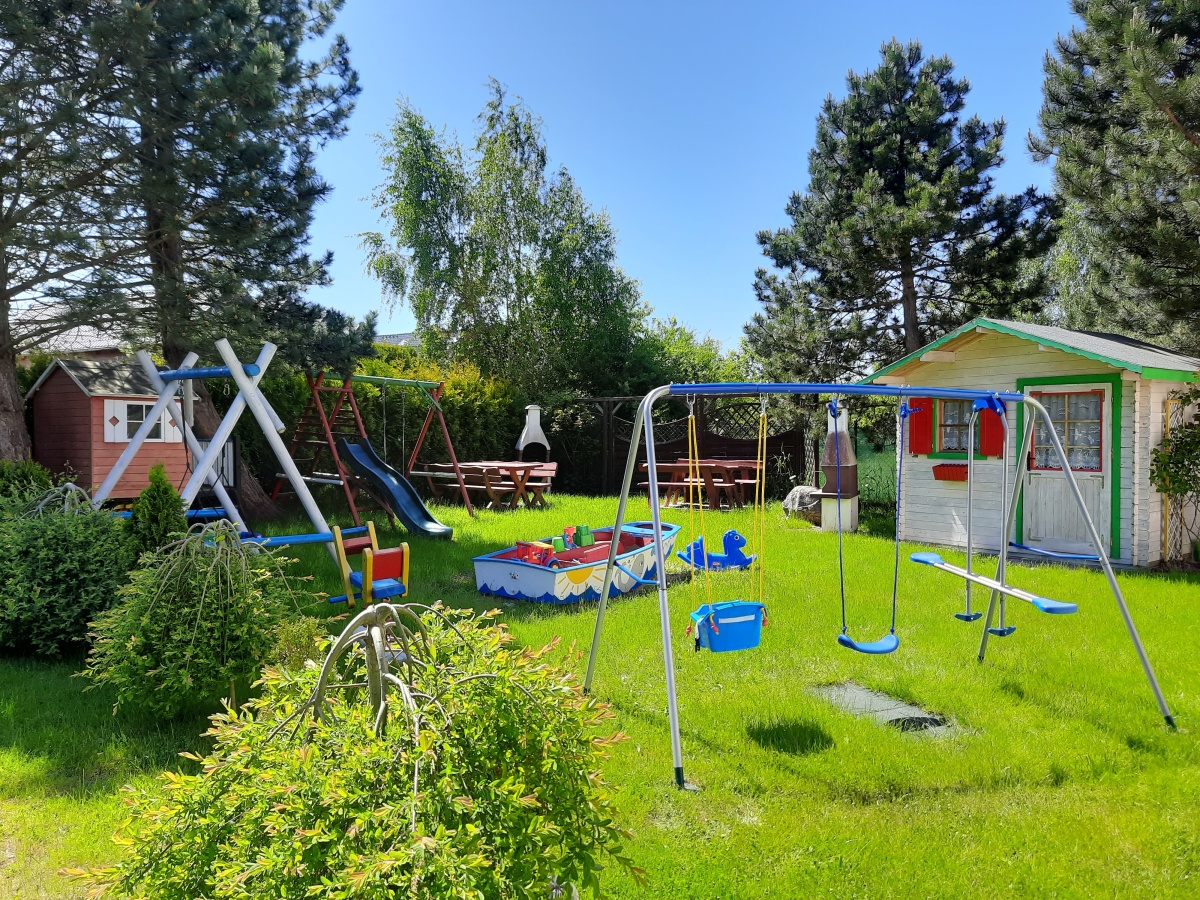 Plac zabaw dla dzieci wyposażony w zjeżdżalnię, huśtawki, drewniany domek, bujaki, piaskownicę z zabawkami.