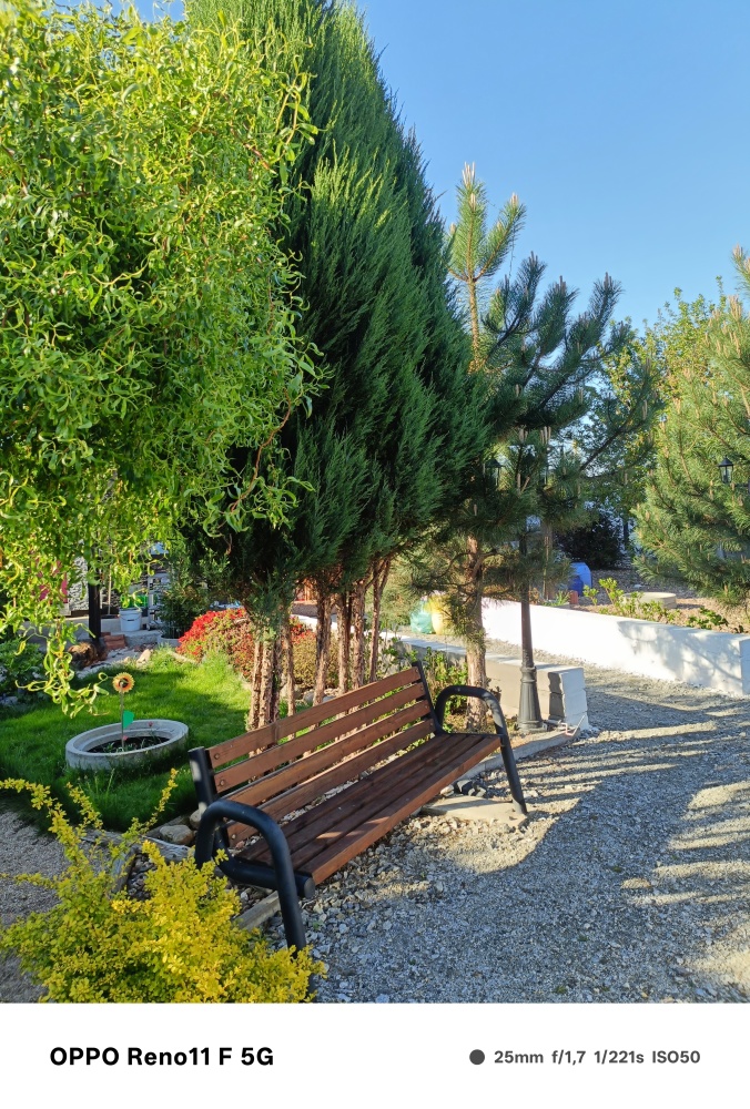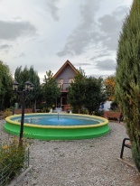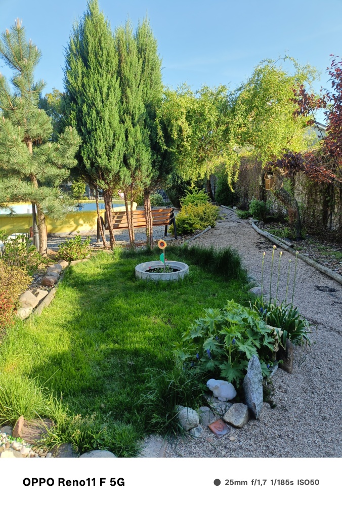 Kameralny zadbany mini park w terenie domu z fontanną, ławkami, miejscem na duże ognisko.