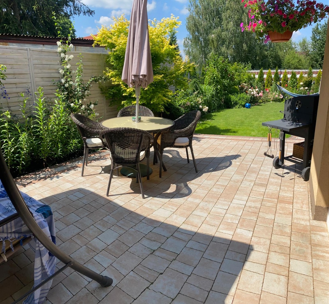Posesja jest ogrodzona (brak jedynie bramy-wszystkie instalacje podprowadzone) i posiada podjazd na conajmniej trzy samochody. Niewątpliwym walorem jest piękny i zadbany ogród który jest oczkiem w głowie Pani domu. Znajdziemy tam piękne róże, kwitnące krzewy, drzewka owocowe oraz inne rośliny i kwiaty na rabatach. Taras usytuowany z tyłu domu pośród drzew co daje poczucie prywatności i spokoju. Osobno niewielka drewutnia. Garaż w bryle budynku z napięciem 440V oraz woda i prąd wyprowadzona na zewnątrz budynku do ogrodu. W ogrodzie znajduje się również rozprowadzona instalacja pod oświetlenie ogrodowe włączane z domu oraz podziemny zbiornik na deszczówkę (2000l)z pompą - przydatna do podlewania ogrodu. Monitoring posesji z poziomu aplikacji na urządzeniu mobilnym.