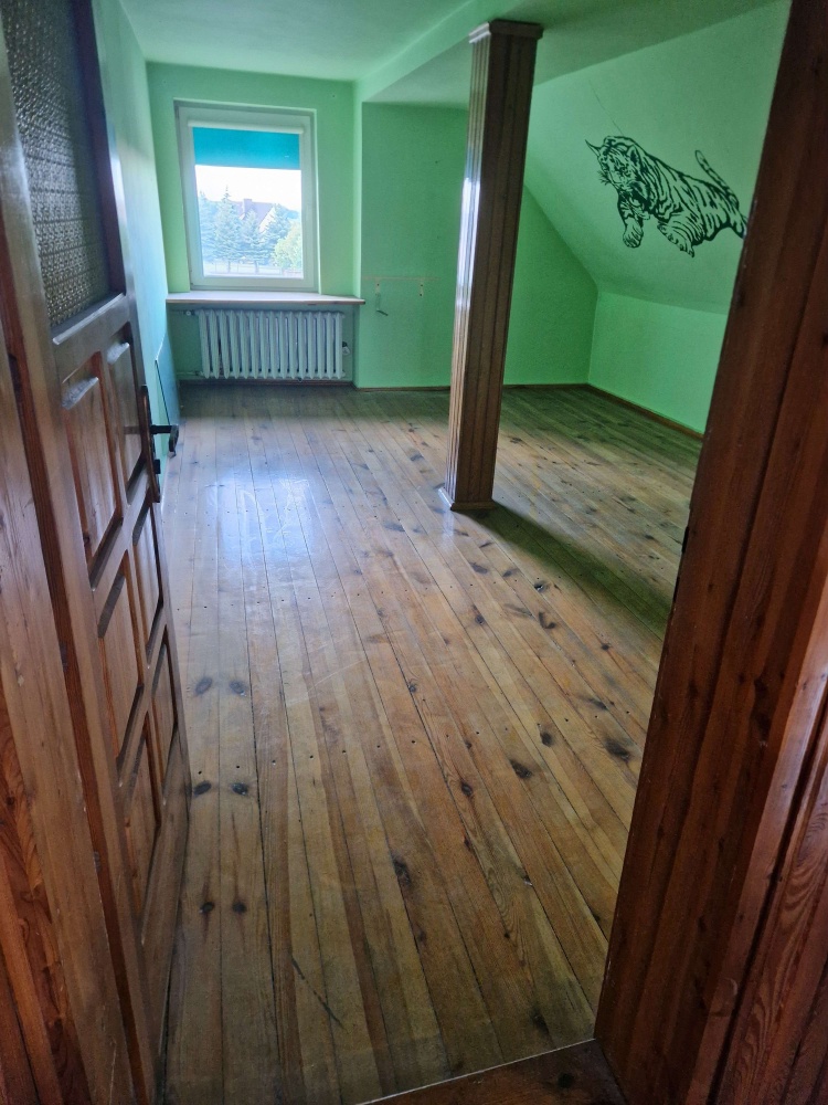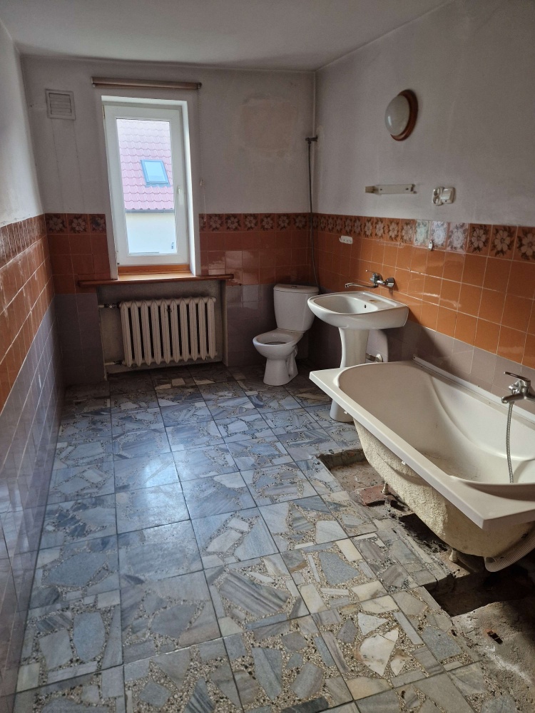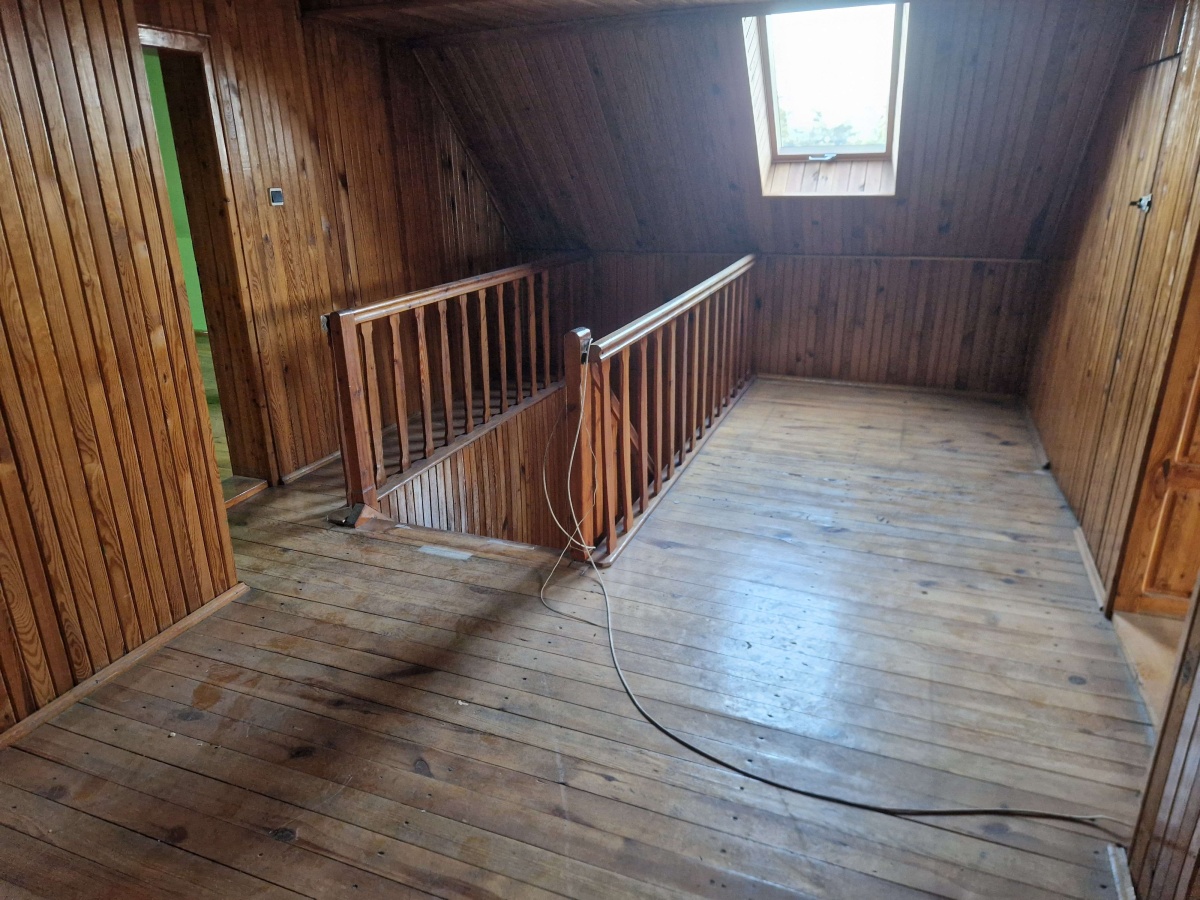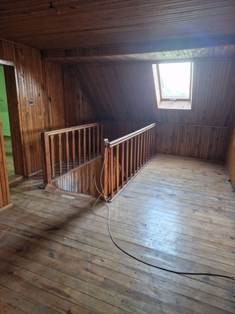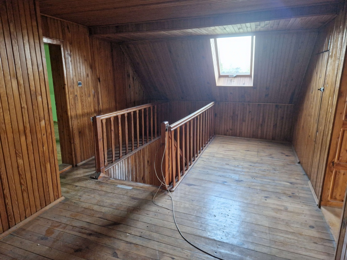- Parter: toaleta, pomieszczenie gospodarcze, 2 pokoje, kuchnia, łazienka, weranda