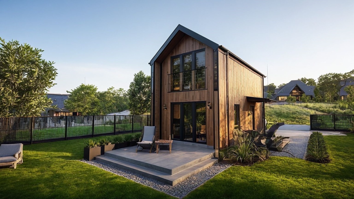 konstrukcja szkieletowa ścian zewnętrznych, ocieplona wełną mineralną lub pianą PUR, wykończona wysokiej klasy deską elewacyjną,