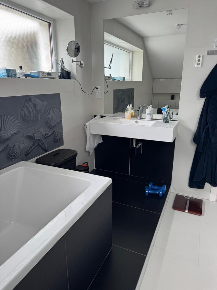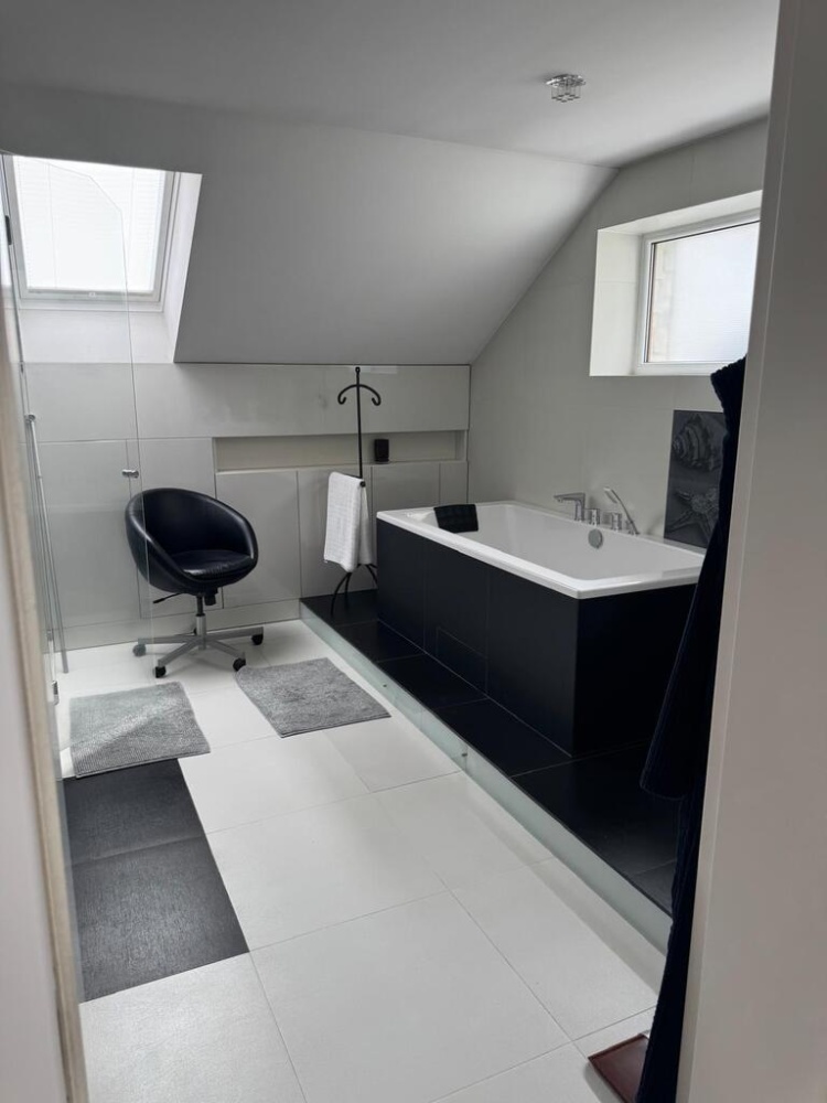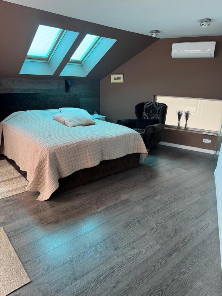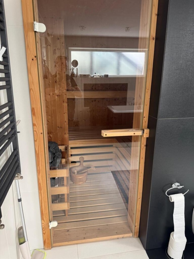 Piętro - dwie sypialnie, gabinet, dwie łazienki, - jedna z nich z sauną oraz pralnia
