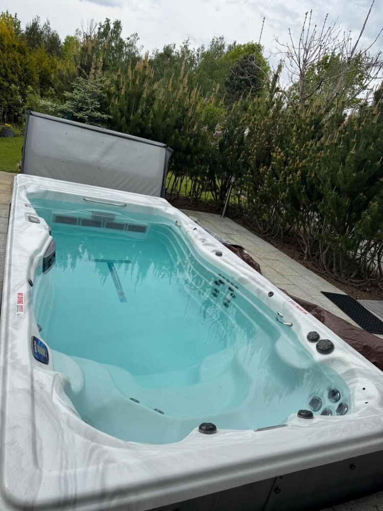 Zaraz po wyjściu z salonu na tarasie znajduje się basen kryty, całoroczny, z masażem, podświetlany.