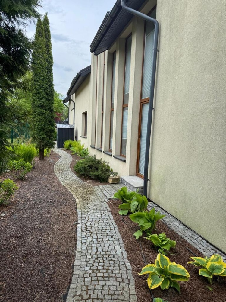 Przepiękny ogród jak z bajki z owocowymi krzewami, kwiatami, krzewami ozdobnymi i drzewami. Na działce znajduje się domek ogrodowy. Działka dobiega do granic rzeki, można spacerować w przepięknym otoczeniu zieleni słuchając szumu przepływającej wody.