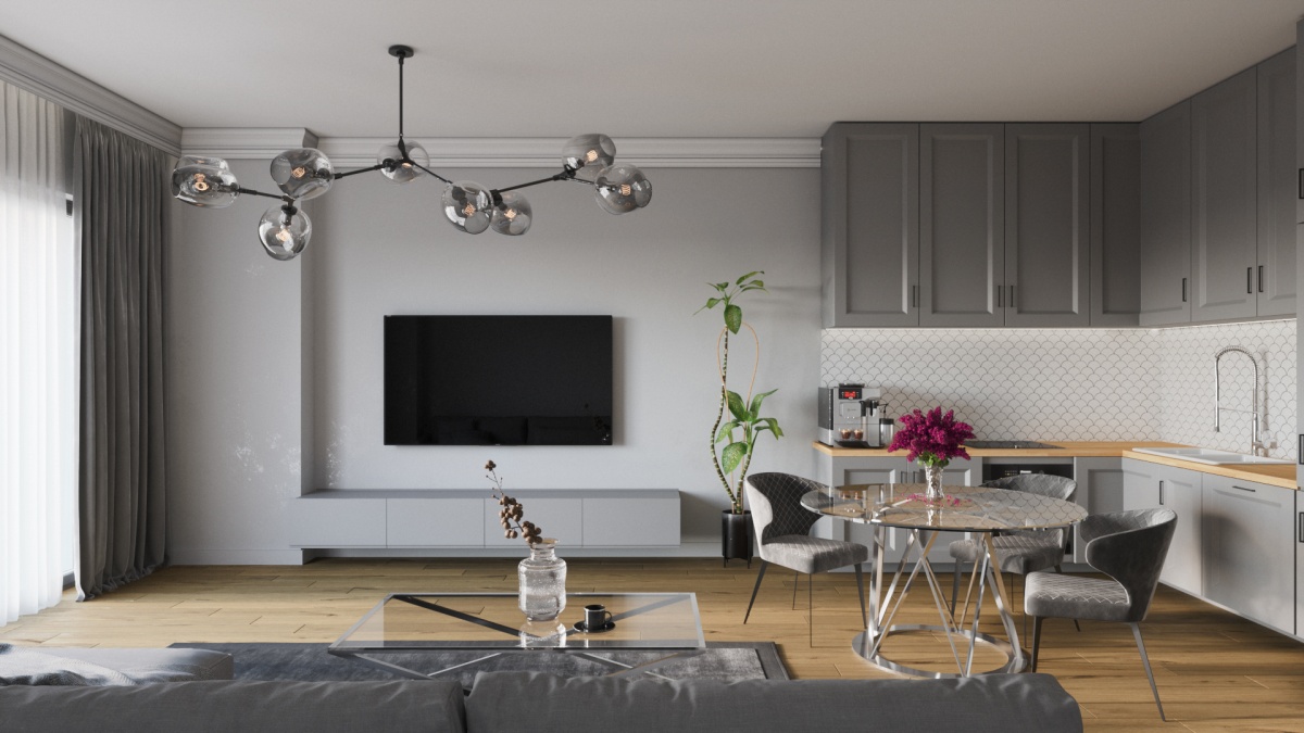 - salon z aneksem kuchennym i wyjściem do ogrodu