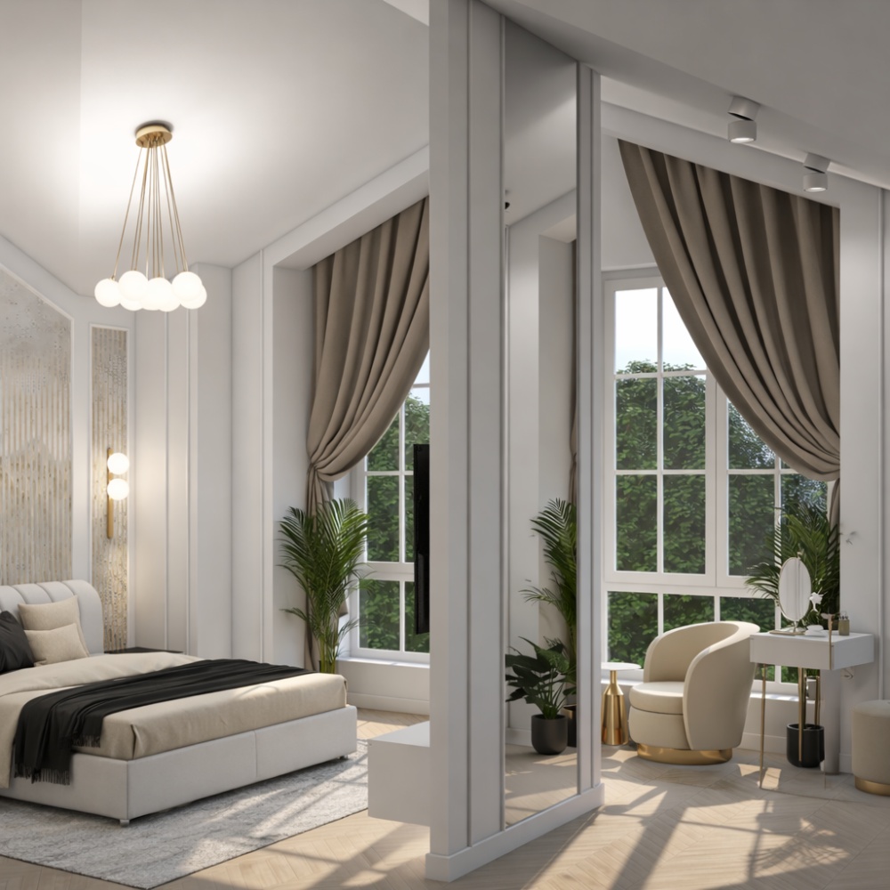 PIĘTRO: na piętrze znajdują się dwie sypialnie oraz imponujący master bedroom z prywatną garderobą/gabinetem. Dodatkowo znajduje się tu przestronna garderoba lub schowek oraz oraz pralnia.