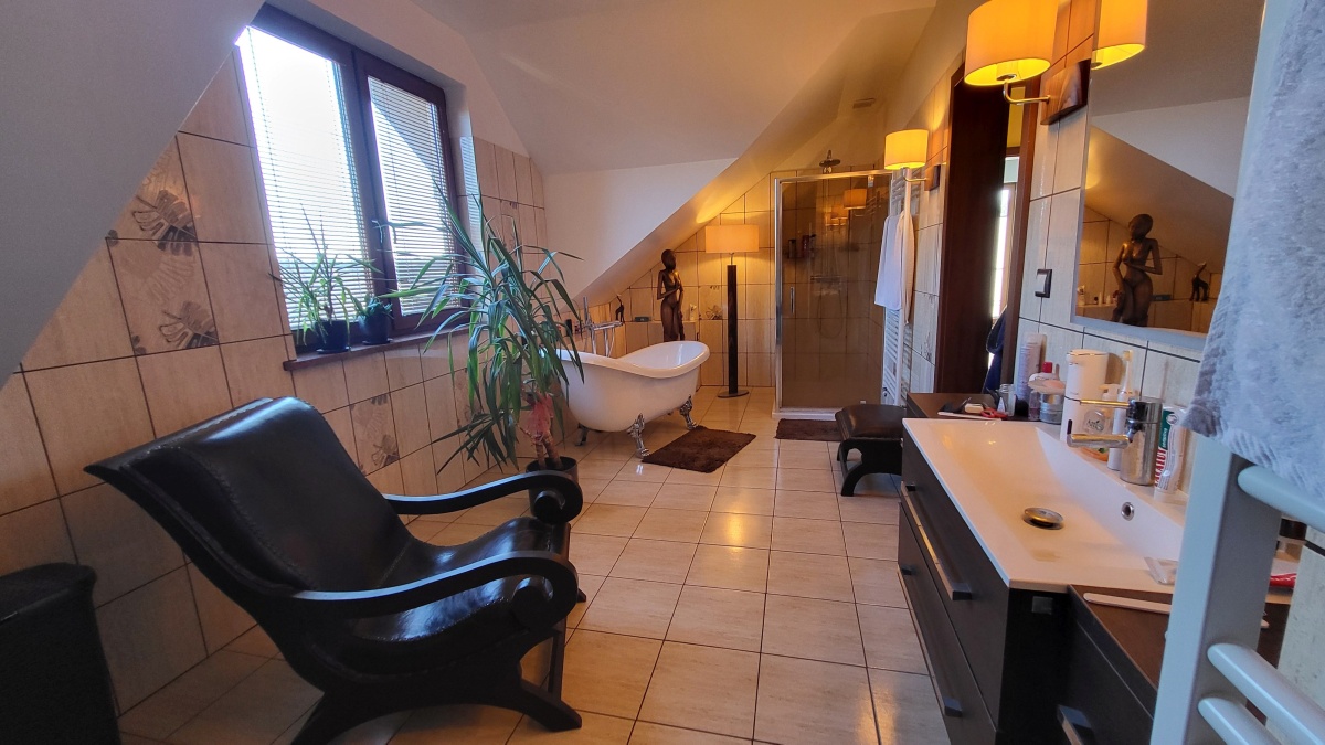 Dom z przyłączem do wszystkich mediów z bezpośrednim dostępem do asfaltowej i oświetlonej drogi gminnej. Wybudowany w roku 2012 na kwadratowej działce o powierzchni 1000 m2. Dom jest ogrodzony przęsłami kutymi z czterech stron. Budynek składa się z 3 pokoi i dużego salonu z antresolą oraz aneksem kuchennym i jadalnią. Kominek z płaszczem wodnym oraz buforem ciepła o pojemności 1000 litrów z pełną automatyką. Pozostałe pomieszczenia na parterze to pokój, wiatrołap, łazienka oraz pomieszczenie gospodarcze prowadzące do garażu. Na piętro prowadzą dębowe ażurowe schody, gdzie znajdują się 2 sypialnie i duża łazienka, oraz duże pomieszczenie obecnie adoptowane na pralnię z suszarnią. W wydzielonej części holu znajdują się przyrządy fitness (bieżnia, rower eliptyczny firmy York). Jedno z okien dachowych (Velux) nad salonem jest sterowane pilotem z czujnikiem deszczu. Wszystkie 3 pokoje oraz salon posiadają klimatyzację (multisplit Samsung). We wszystkich pomieszczeniach na parterze jest ogrzewanie podłogowe. Obie łazienki mają również ogrzewanie podłogowe oraz kaloryfery drabinkowe. W pomieszczeniu gospodarczym zainstalowana jest stacja zmiękczania wody (cała armatura grzewczo hydrauliczna firmy Viessmann). Bezpośrednio z jadalni wychodzi się na wielki 56 m taras (częściowo zadaszony) z cudownym widokiem na las. Dom wyposażony jest także w odkurzacz centralny oraz garaż dwustanowiskowy. Na dachu budynku zamontowany jest próżniowy panel solarny do podgrzewania wody użytkowej. W ogrodzie jest domek na narzędzia i drewutnia. Działka posiada automatyczne nawadnianie ogrodu (Gardena) oraz siatkę przeciw kretom na całej powierzchni trawnika. Na działce wydzielone jest również miejsce na ognisko. Nad bezpieczeństwem czuwa alarm trzystrefowy (czujki wewnętrzne, kontaktrony w oknach i czujki zewnętrzne). Wyposażenie domu częściowo podlega sprzedaży wraz z domem, szczegóły do uzgodnienia.
