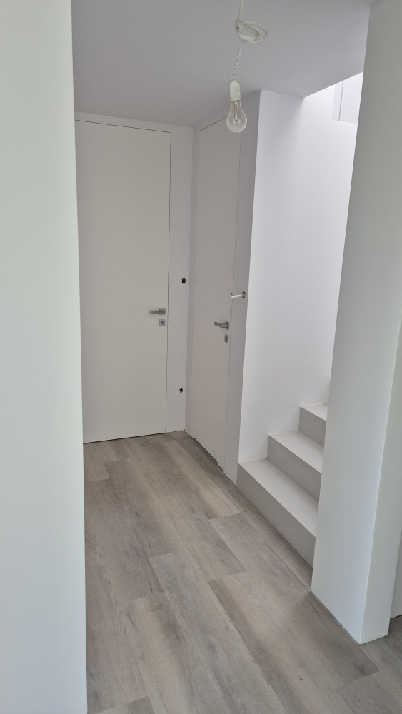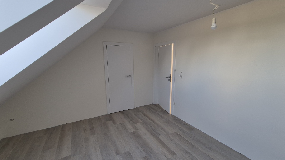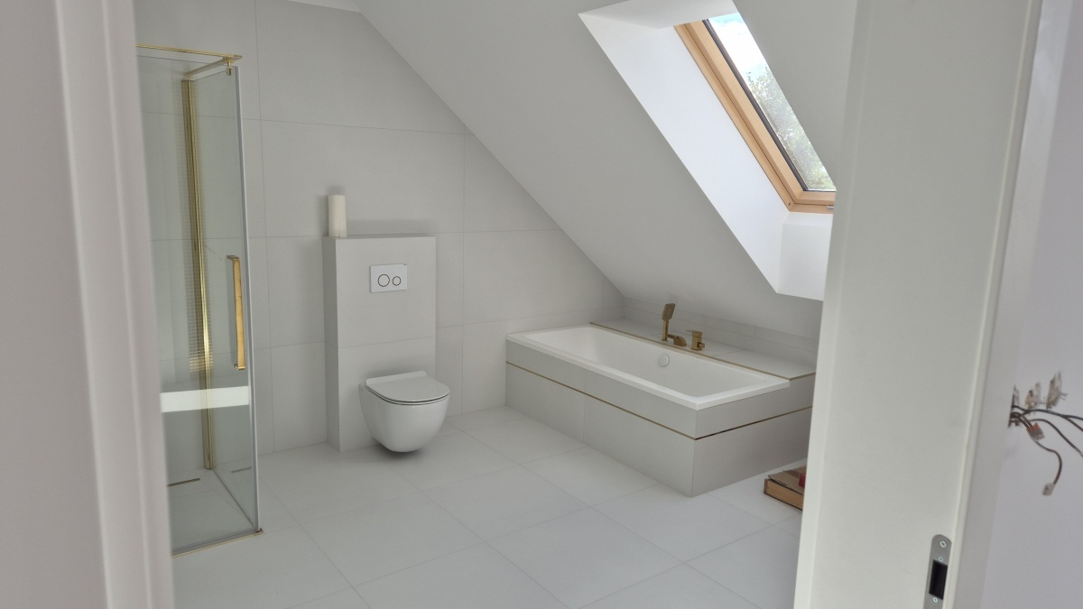 Nowoczesna bryła typu stodoła, duże przeszklenia, garaż w bryle budynku. Na parterze salon z kuchnią, dodatkowy pokój i WC; na poddaszu 3 sypialnie, łazienka, garderoba i pralnia.