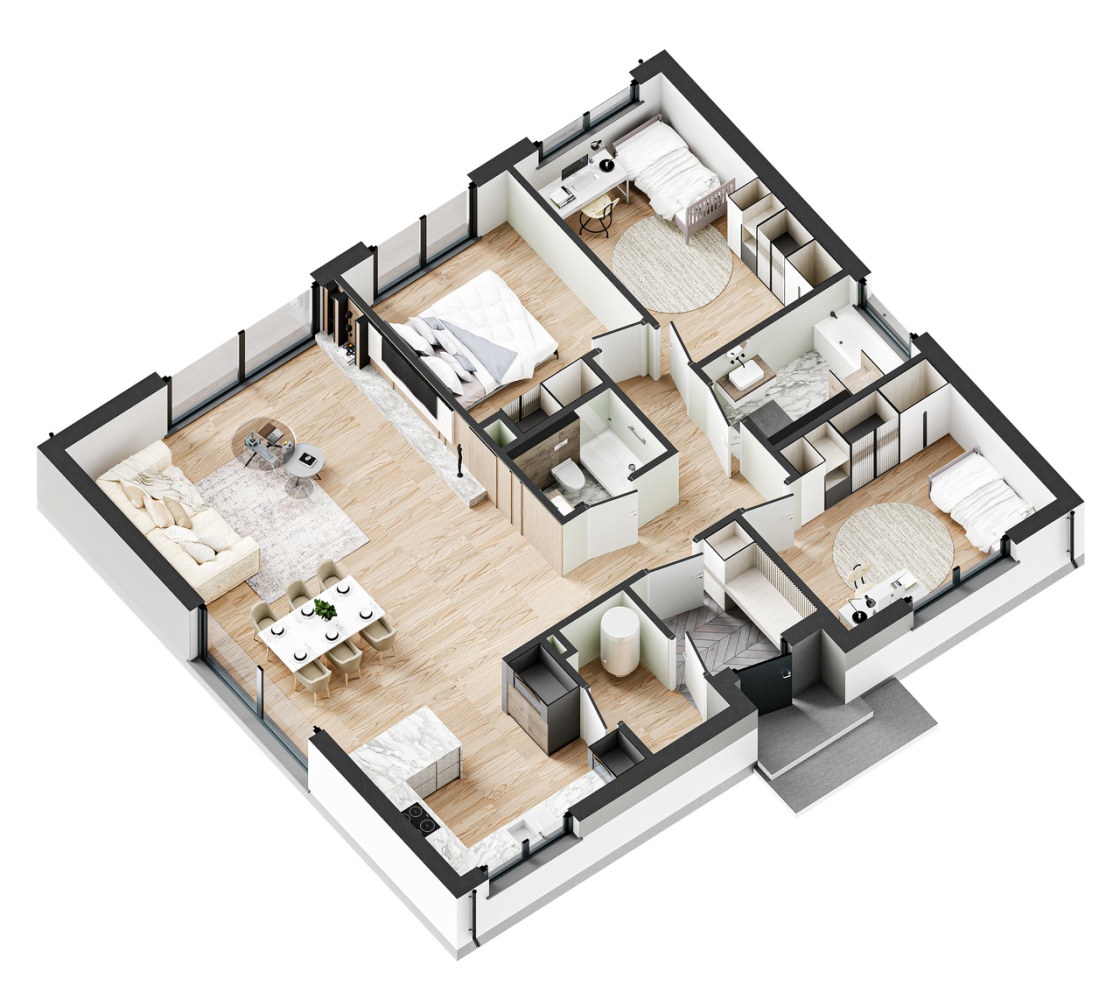 3 sypialnie (13,08 + 12,38 + 11,87 mkw) , 2 łazienki (5,27 + 3 mkw), przedpokój, pomieszczenie techniczne