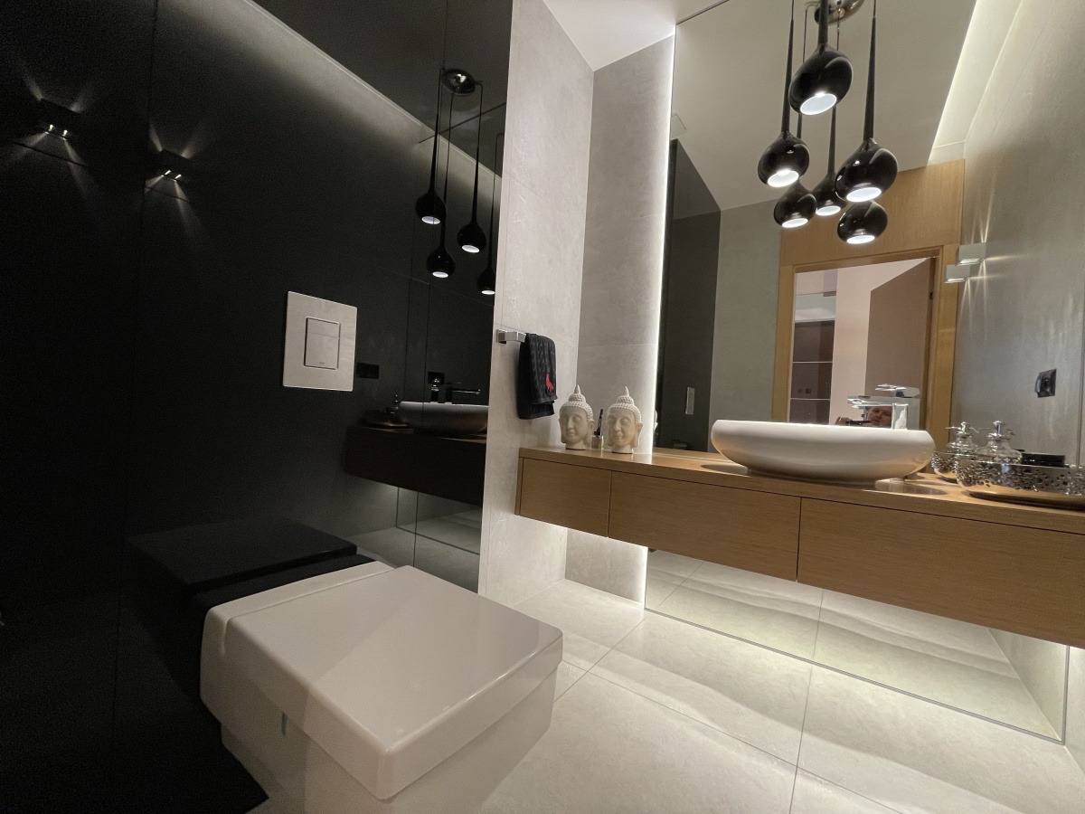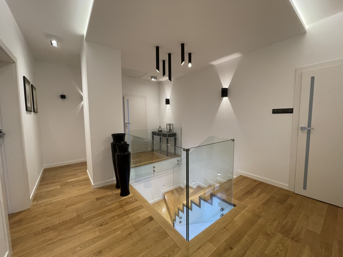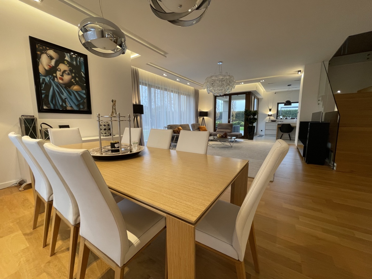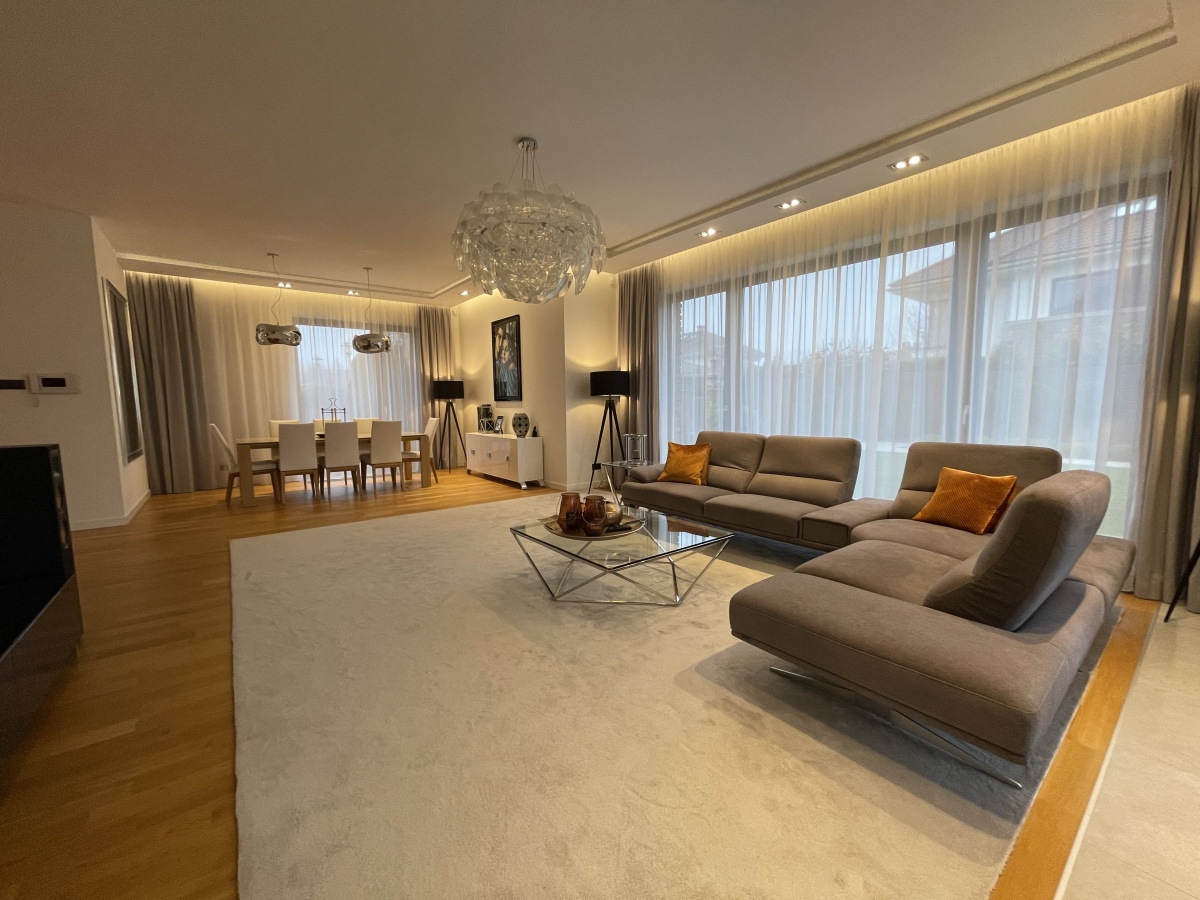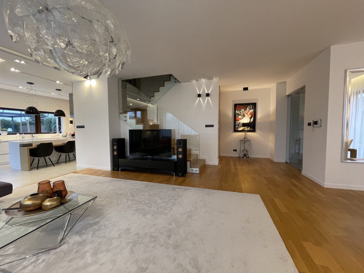 Wnętrza wykończono materiałami klasy premium: egzotyczny parkiet, granitowe blaty oraz stolarka na zamówienie podkreślają elegancki i ponadczasowy charakter nieruchomości. Piękny ogród z wyodrębniony miejscem rekreacyjnym, jadalnią , zadaszoną pergolą , jacuzzi, taras. Pełna ochrona patrolu 24 H, system alarmowy profesjonalne kamery monitorujące teren.