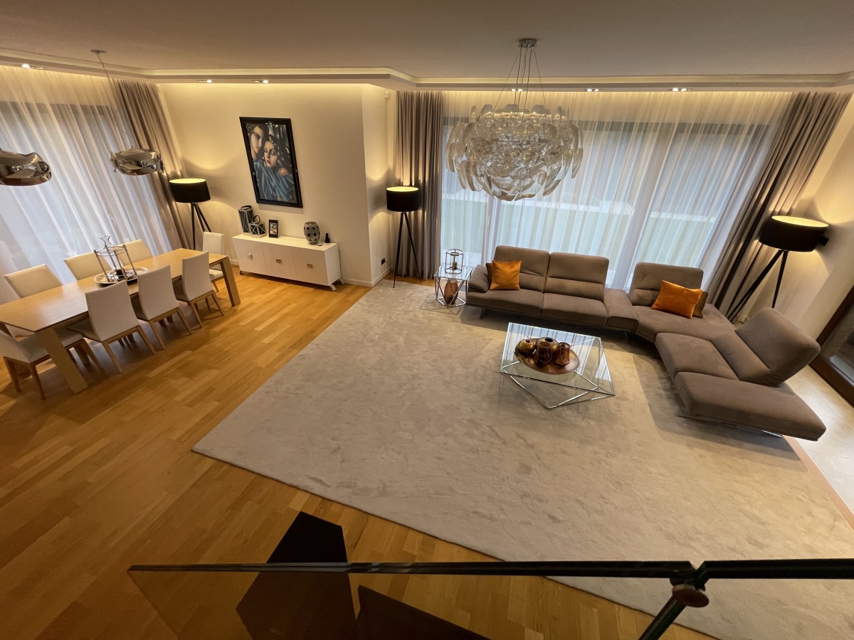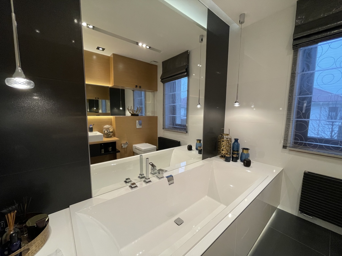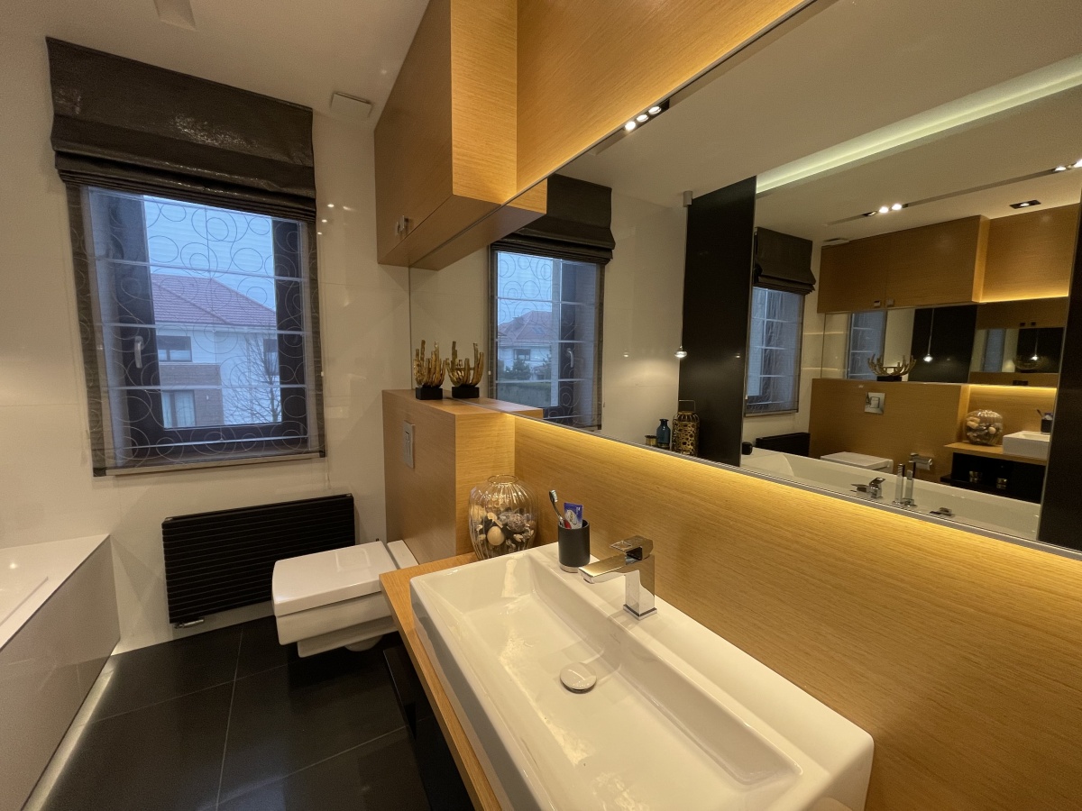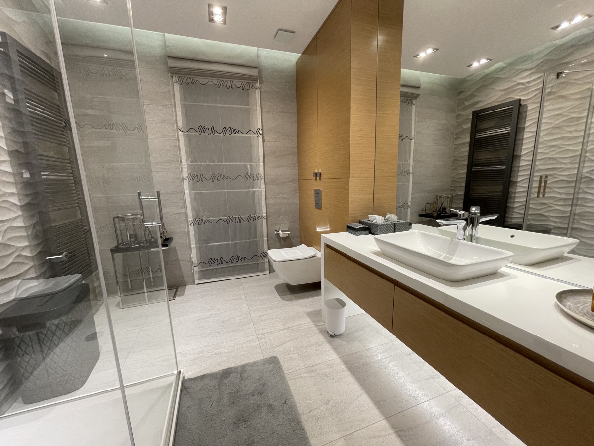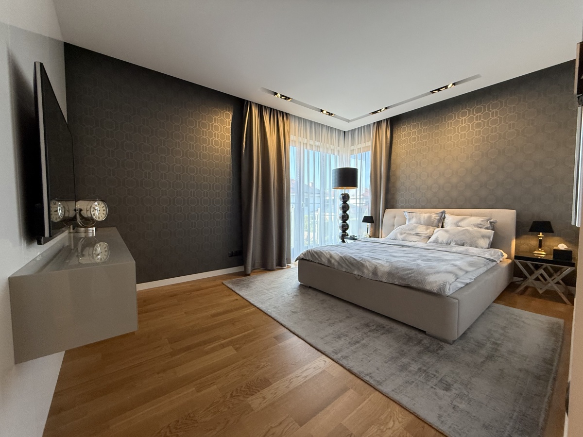 Wnętrza wykończono materiałami klasy premium: egzotyczny parkiet, granitowe blaty oraz stolarka na zamówienie podkreślają elegancki i ponadczasowy charakter nieruchomości. Piękny ogród z wyodrębniony miejscem rekreacyjnym, jadalnią , zadaszoną pergolą , jacuzzi, taras. Pełna ochrona patrolu 24 H, system alarmowy profesjonalne kamery monitorujące teren.