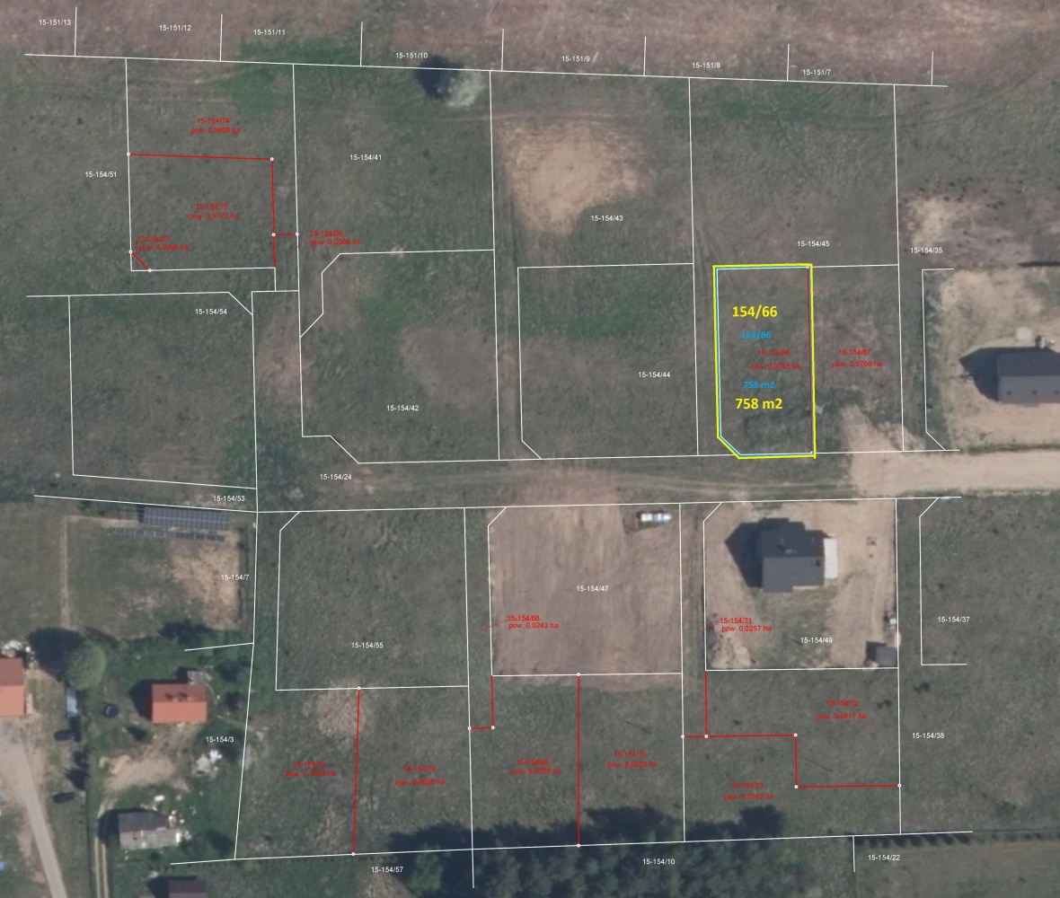 Kształt: działki 154/67 - prostokąt o wymiarach 39 x 21 m