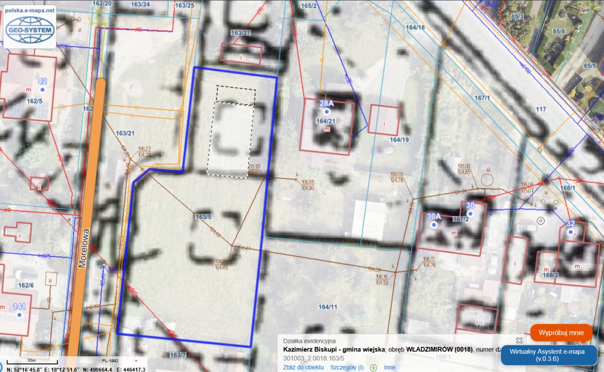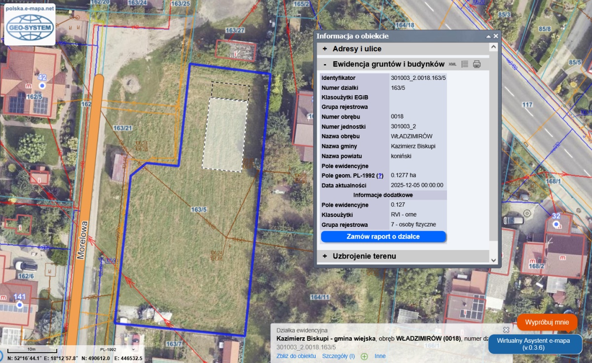 Sprzedam działkę 301003_2.0018.163/5 przy ul. Morelowej w Władzimirowie. W księdze wieczystej jeszcze widnieje spadkodawca. Obecnie jest to działka rolna VI klasy. W MPZP przewidziana jako 5MN tj. pod zabudowę jednorodzinną z możliwością prowadzenia działalności gospodarczej z ograniczeniem zasięgu do działki. W MPZP są to dwie działki, ale sprzedaję niepodzieloną całość. Działka niezbudowana, niezakrzaczona, nieogrodzona. Łódkę i szpargały sąsiad usunie. Na działce znajduje się kanalizacja z kolektorem, nad działką linia elektryczna. Media albo przy działce albo do doprowadzenia z naprzeciwka przez drogę utwardzoną. Od wąskiej strony od północy znajduje się sklep spożywczy, który oddziela działkę od drogi krajowej (podwórze sklepu obecnie jest przejezdne, zgodnie z MPZP ul. Morelowa powinna być ślepa). Jest to jedna z ostatnich działek wolnych w tym osiedlu domków jednorodzinnych. Gdybym ja miał się tam wybudować, spróbowałbym wcisnąć dom z garażem w tę wąską część północną, z tarasem zwróconym na południe na duży ogród, który ewentualnie można będzie później wydzielić i sprzedać jako osobną działkę. Zresztą proszę spróbować samemu różnych konstelacji przyszłej zabudowy wedle gustu o możliwości. Ponieważ mieszkam we Wrocławiu, nie będę przyjeżdżać na pokazy. Zapraszam do samodzielnej wizji lokalnej oraz do skorzystania z geoportalu. Preferuję kontakt na maila alexander@ilgmann.pl, tylko bardzo niechętnie na telefon. Pośrednika, gdybym chciał sprzedawać przez biuro, to ja już mam jednego w Koninie, więc proszę o kontakty tylko ze strony kupujących, nie pośredników.
