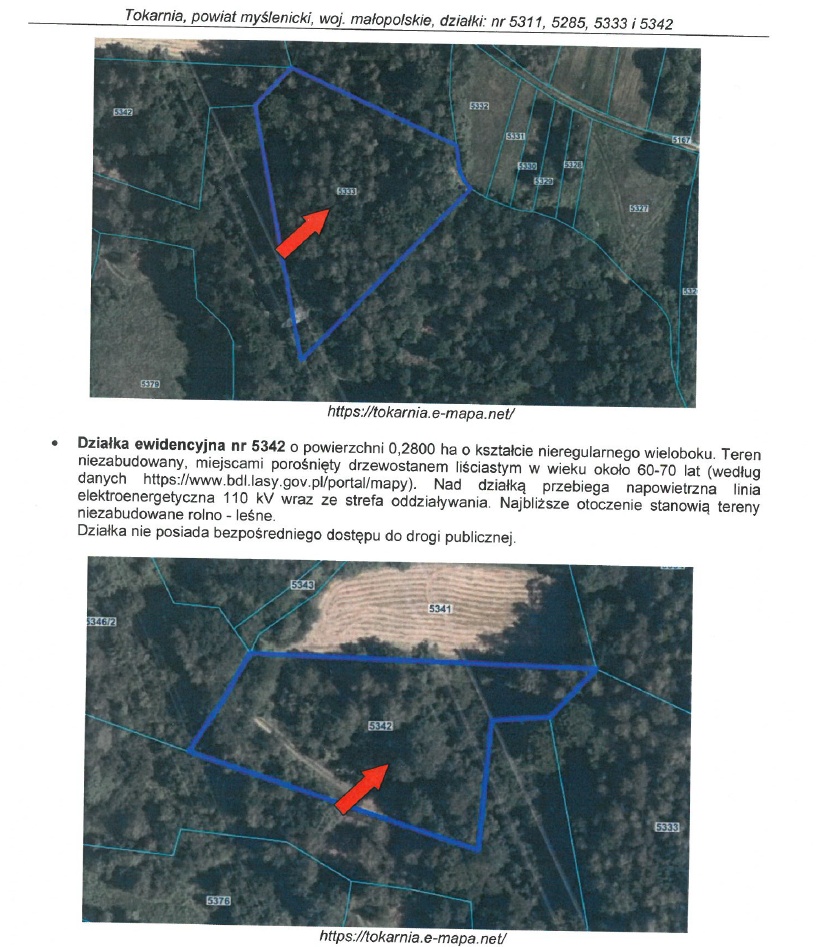 Przedmiotem sprzedaży jest prawo własności nieruchomości gruntowej niezabudowanej, położonej w Tokarni, gmina Tokarnia, powiat myślenicki, województwo małopolskie, składającej się z działek ewidencyjnych nr 5311, 5285, 5333, 5342 o łącznej pow. 1,1300 ha, dla której to nieruchomości Sąd Rejonowy w Myślenicach IV Wydział Ksiąg Wieczystych prowadzi księgę wieczystą o numerze KR1Y/00047670/9. Cena wywoławcza: 5.000,00 zł (pięć tysięcy złotych 00/100).