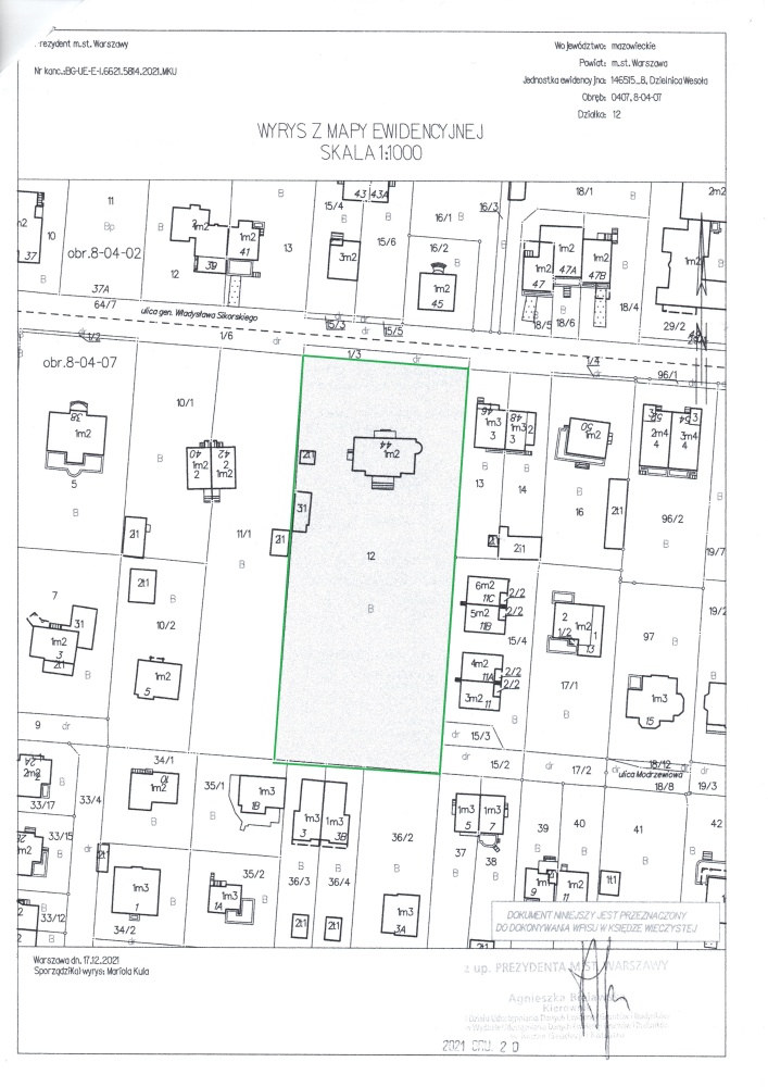 Na działce wybudowany jest budynek mieszkalny wolnostojący. W związku z tym, że nieruchomość jest wpisana do GEZ złożony został wniosek o jego wyłączenie. Aktualnie jest wystawiona opinia Prezydenta Miasta Stołecznego Warszawy z którego wynika, że nie ma podstaw do pozostawienia go w gminnej ewidencji zabytków.