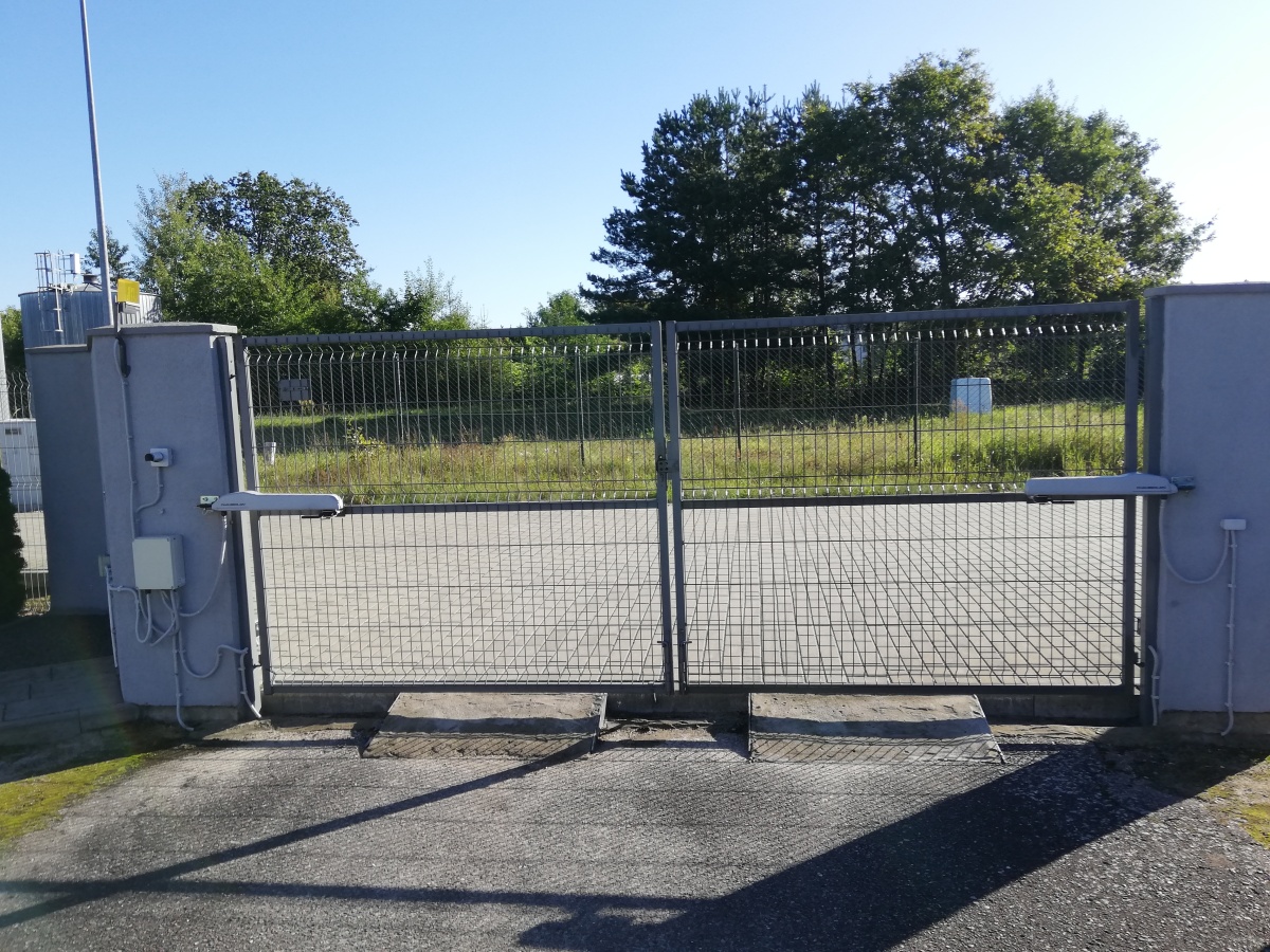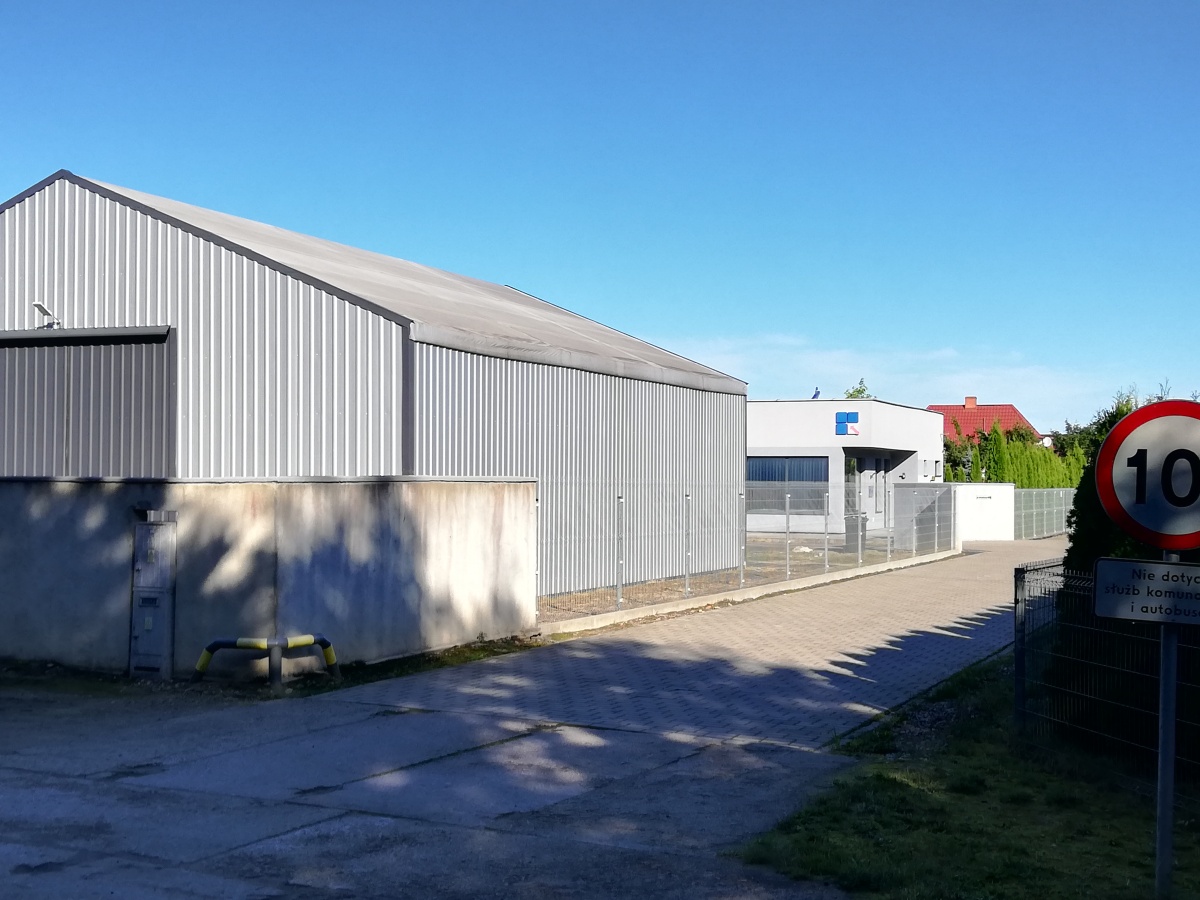 Dojazd: droga asfalt + polbruk. Oświetlenie zewn. miejscowe + wewnętrzne własne. Media : prąd, woda. Ogrzewanie w bud. biurowym własne (ciepła woda). Dwie bramy wjazdowe w tym jedna automat. Skład (na opał i gospodarczy na narzędzia) - oddzielny drewniany. Wewnątrz plac utwardzony. Chodnik. Wjazd na halę 4m szer + 3 m beton zbroj.