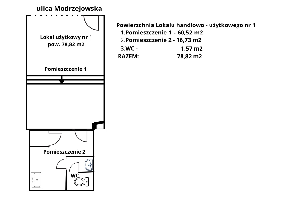 Lokal składa się z : Pomieszczenie nr 1 (Sala sprzedaży) - 60,52 mkw., Pomieszczenie nr 2 (Zaplecze) - 16,73 mkw., WC - 1,57 mkw.