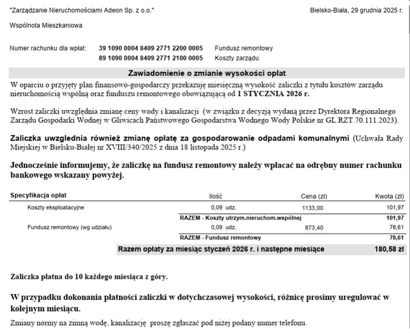 Bardzo niskie koszty utrzymania: 180 koszty stałe (w tym prąd na klatce schodowej, sprzątanie klatki, fundusz remontowy, opłaty administracyjne), do tego należy doliczyć - woda wg zużycia + śmieci. Prąd, gaz - opłaty do dostawców mediów.
