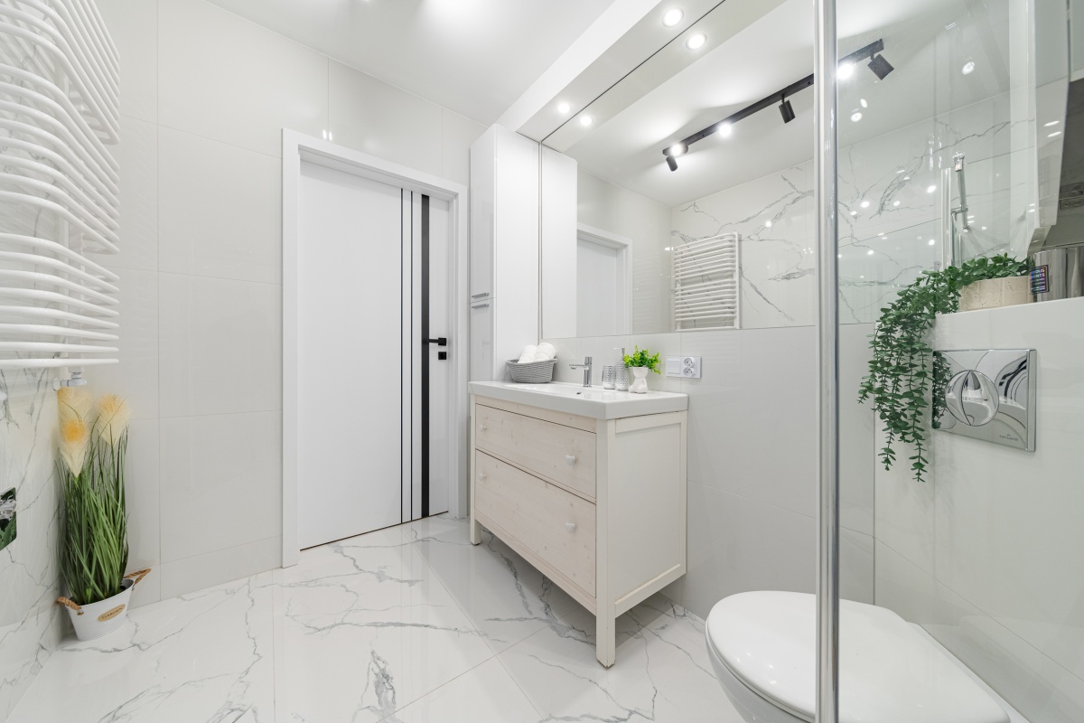 Łazienka: piękna glazura, która ma unikatowy połączony ze sobą wzór marmuru, który jest połączony w jednej całości. Duża szafka z umywalką, słupek łazienkowy do przechowywania kosmetyków, prysznic z odpływem liniowym oraz wc.