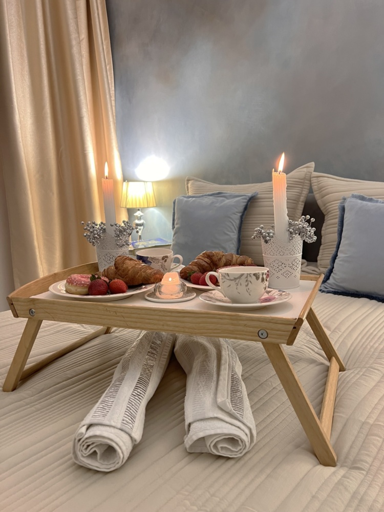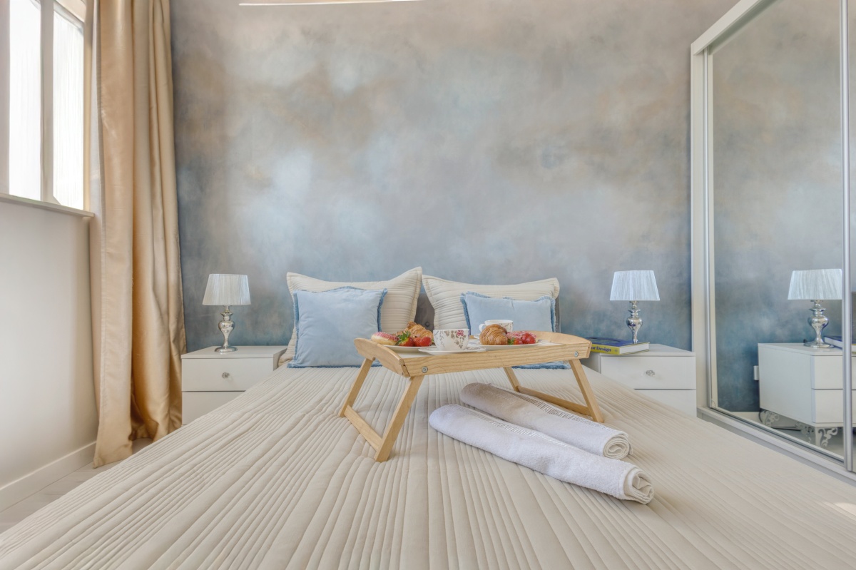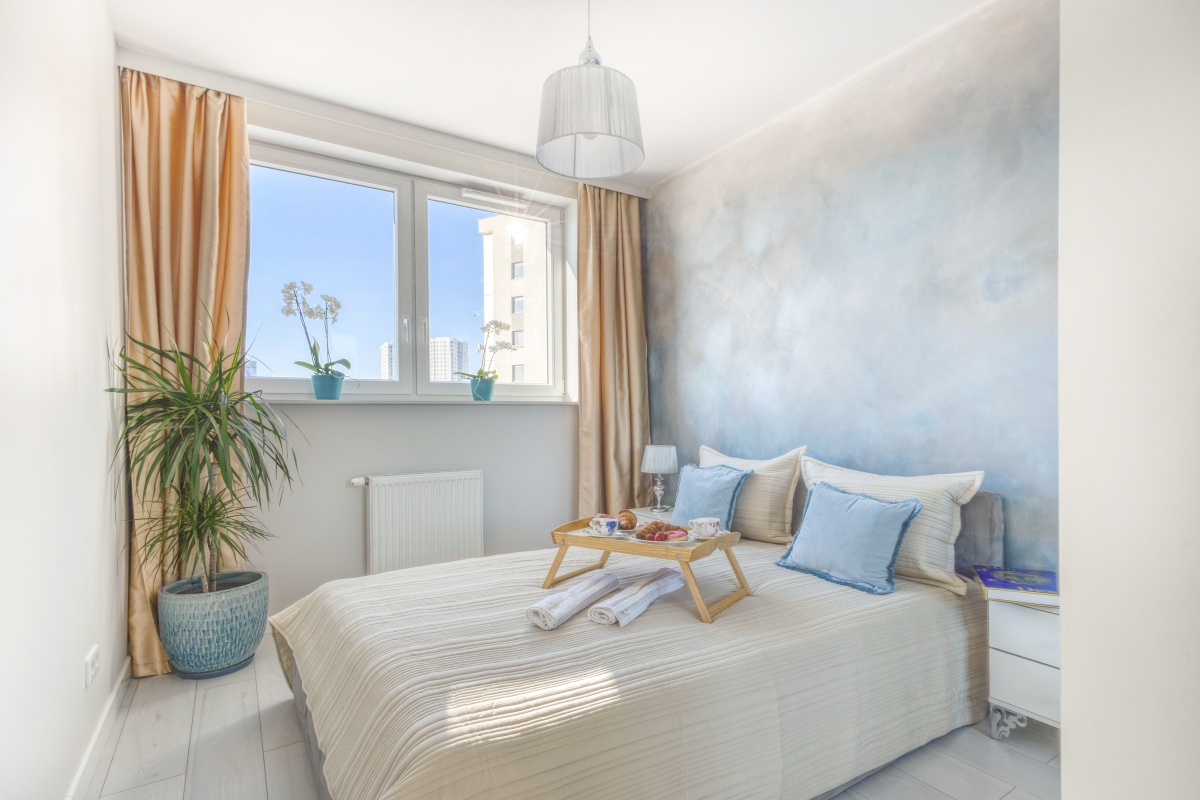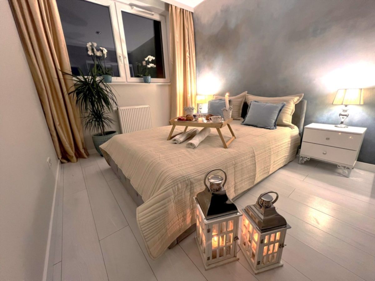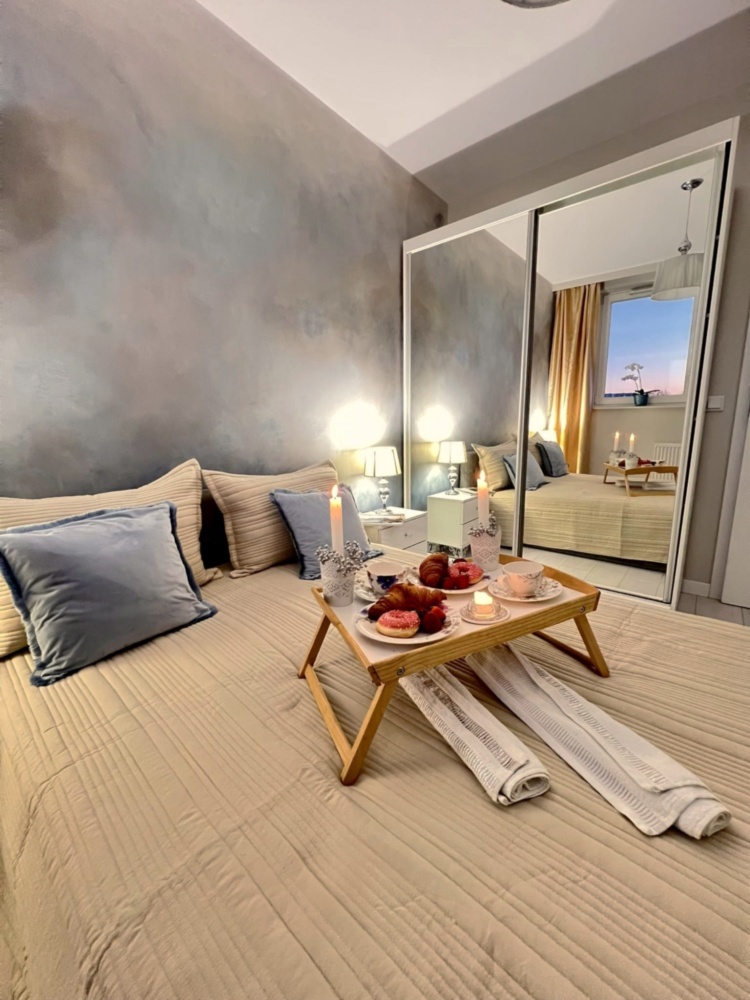 Skąpana w beżach i złocie sypialnia została wyposażona w welurowe łóżko z wygodnym oparciem oraz 2 drzwiową szafę z lustrzanymi drzwiami przesuwnymi oprawionymi w białe ramy. Niepowtarzalny urok tego miejsca zapewnia ściana z artystycznym malowidłem wykonanym w technice ombre, inspirowana burzowym niebem, przez które przebijają się złote refleksy zachodzącego słońca. Uzupełnieniem tej kompozycji są utrzymane w barwach szarości i srebra lamki nocne ustawione na białych szafkach w stylu glamour z kryształowymi gałkami.