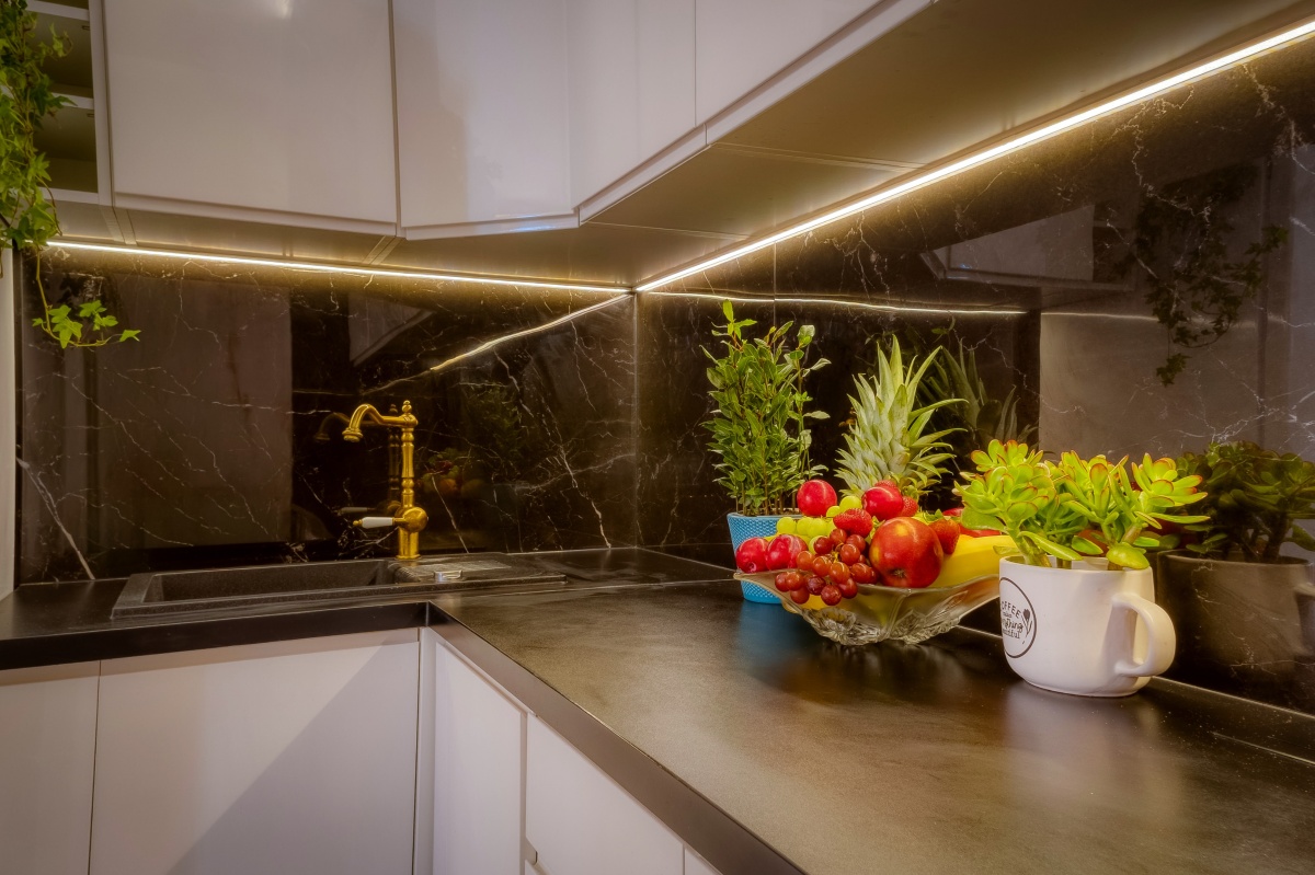 Aneks kuchenny, to połączenie bieli minimalistycznych mebli oraz czerni marmurowych kafli, tak charakterystyczne dla stylu glamour. Dopełnienie tej kompozycji stanowi konglomeratowy zlew, mosiężny kran i markowy sprzęt AGD: zmywarka, lodówka z zamrażarką, piekarnik oraz płyta indukcyjna i pochłaniacz.