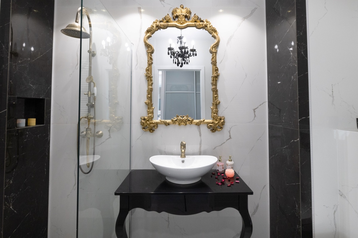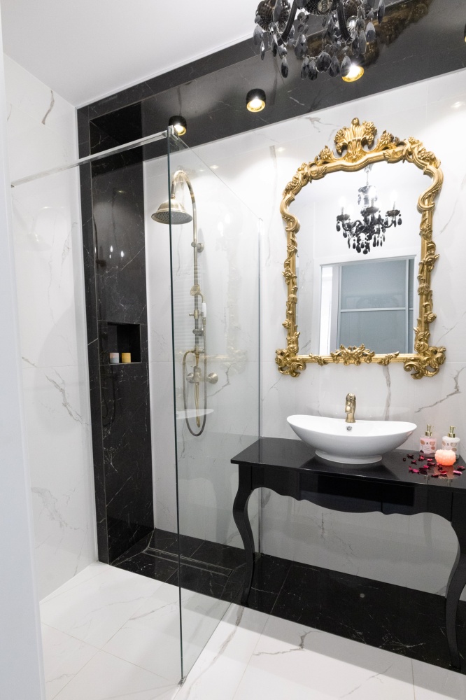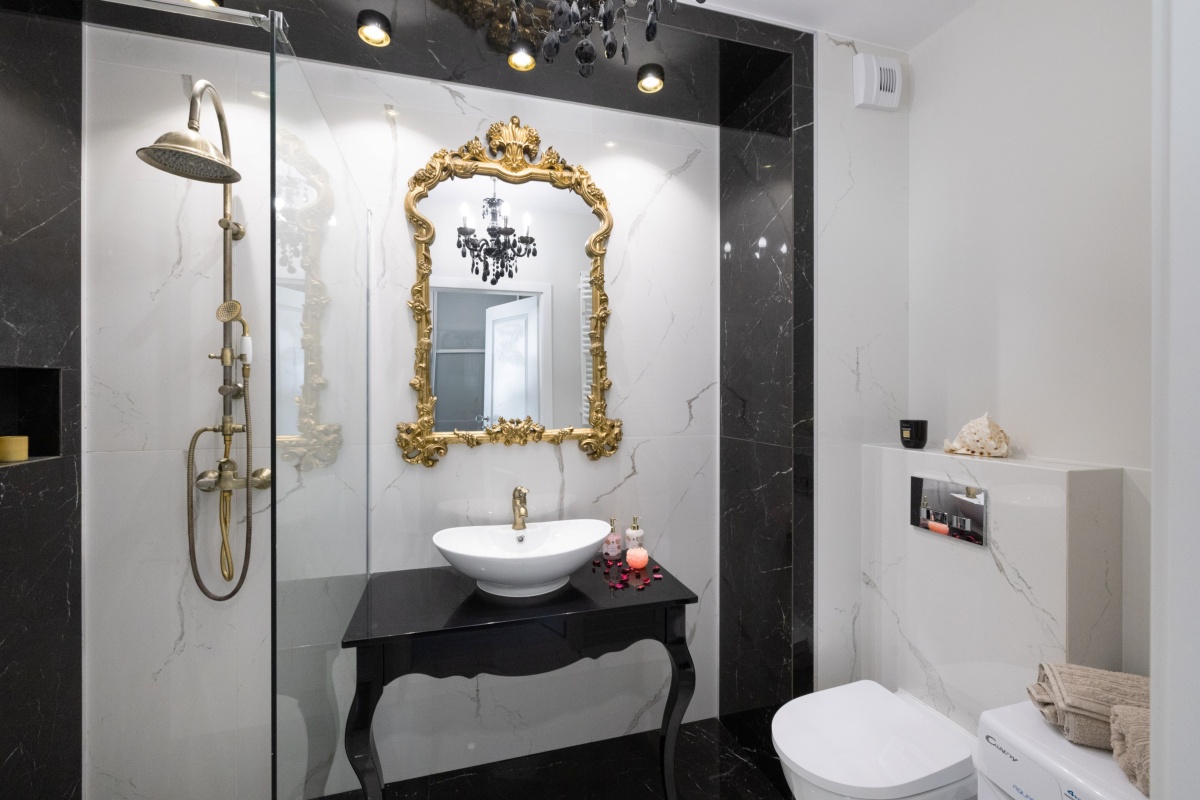 Barokowy przepych i elegancja to cechy łazienki utrzymanej w barwach bieli i czerni przełamanej różnymi odcieniami złota. Komfort i wygodę zapewnia obszerna kabina prysznicowa osłonięta hartowaną szybą. Centralnym punktem kompozycji jest designerskie lustro, oprawione w złotą bogato zdobioną ramę, dominującą nad białą ceramiczną umywalką osadzoną na czarnej, stylowej konsoli.