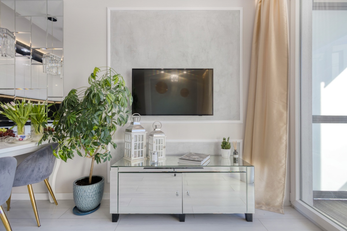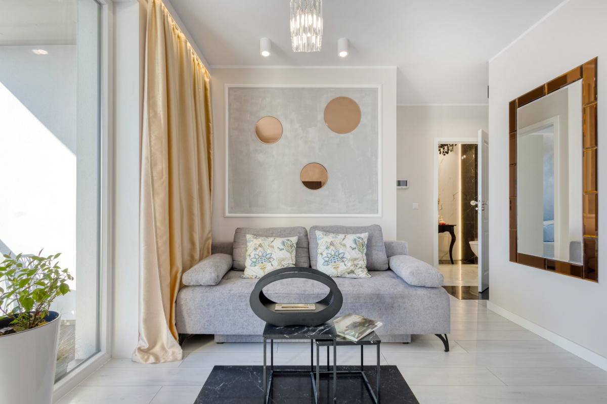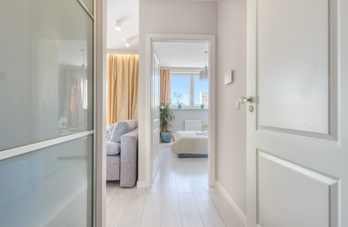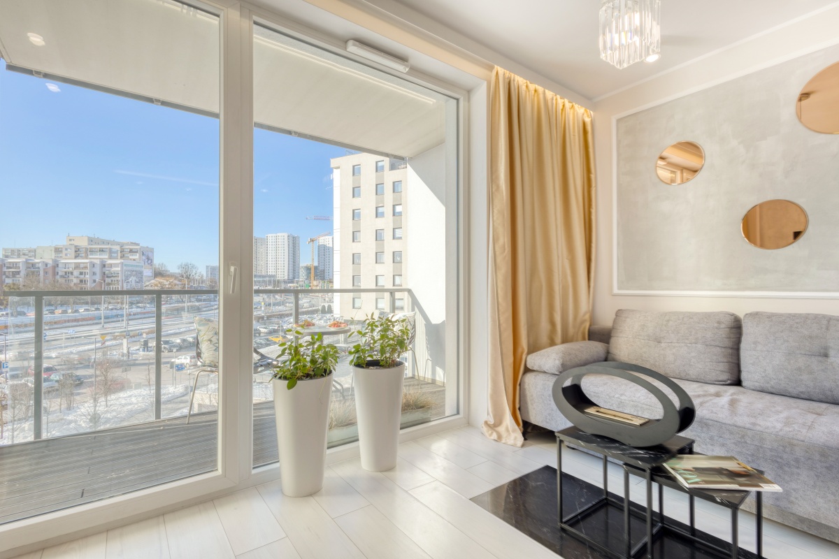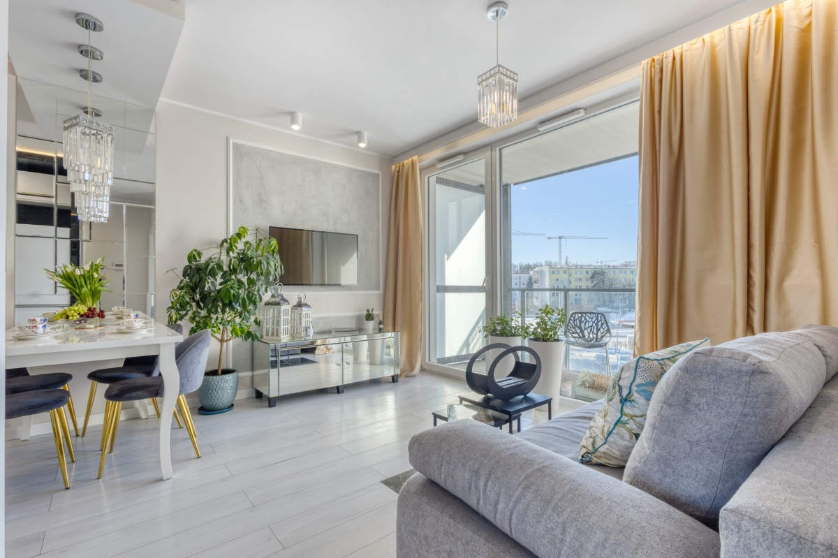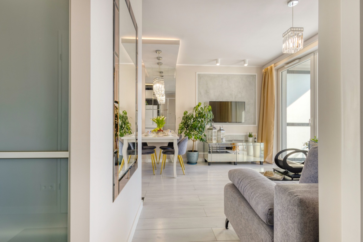 Prezentowany apartament otwiera przedpokój, którego atutem jest obszerna szafa wnękowa, dyskretnie ukryta za przesuwanymi drzwiami z mlecznego szkła. Przedpokój zaprasza do eleganckiego i dobrze doświetlonego zachodnim słońcem salonu oraz przytulnej sypialni i stylowej łazienki. Od razu widać, iż we wnętrzu rządzi szlachetna, stonowana i delikatnie zróżnicowana kolorystyka, z dominującym beżem ścian, szarością betonów i tkanin, bielą mebli, co w połączeniu z kryształowymi i złotymi dodatkami inspirowanymi stylem glamour stało się znakiem rozpoznawczymi prezentowanego apartamentu.