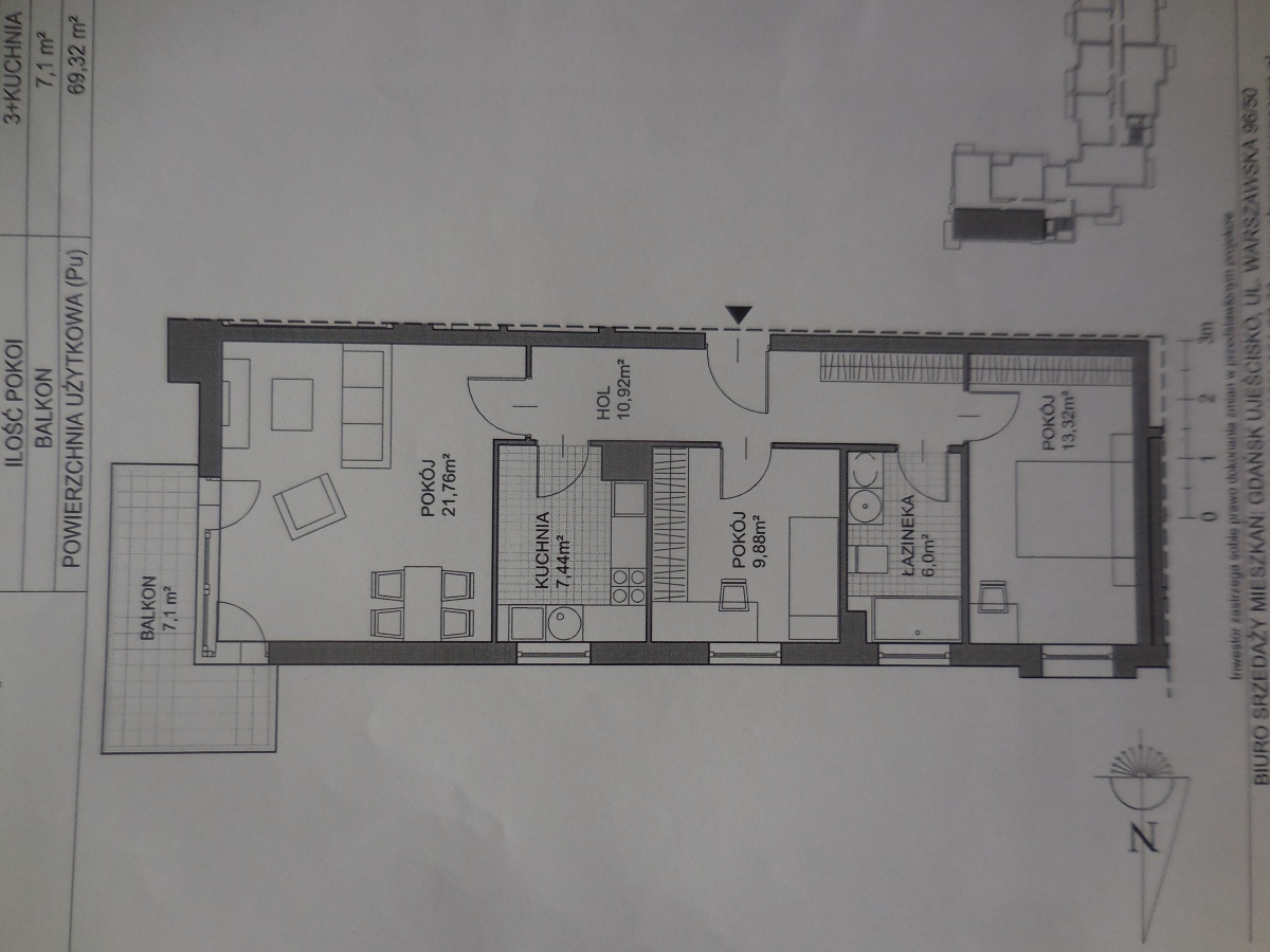 3-pokojowe mieszkanie o powierzchni 69,32 m2, w skład którego wchodzi: