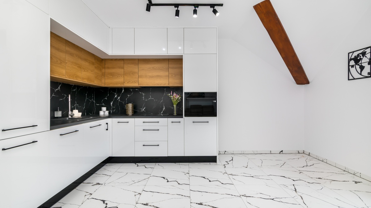 kuchnia w pełni wyposażona w sprzęt AGD: piekarnik, mikrofalówka, płyta elektryczna, zmywarka, okap, lodówka,