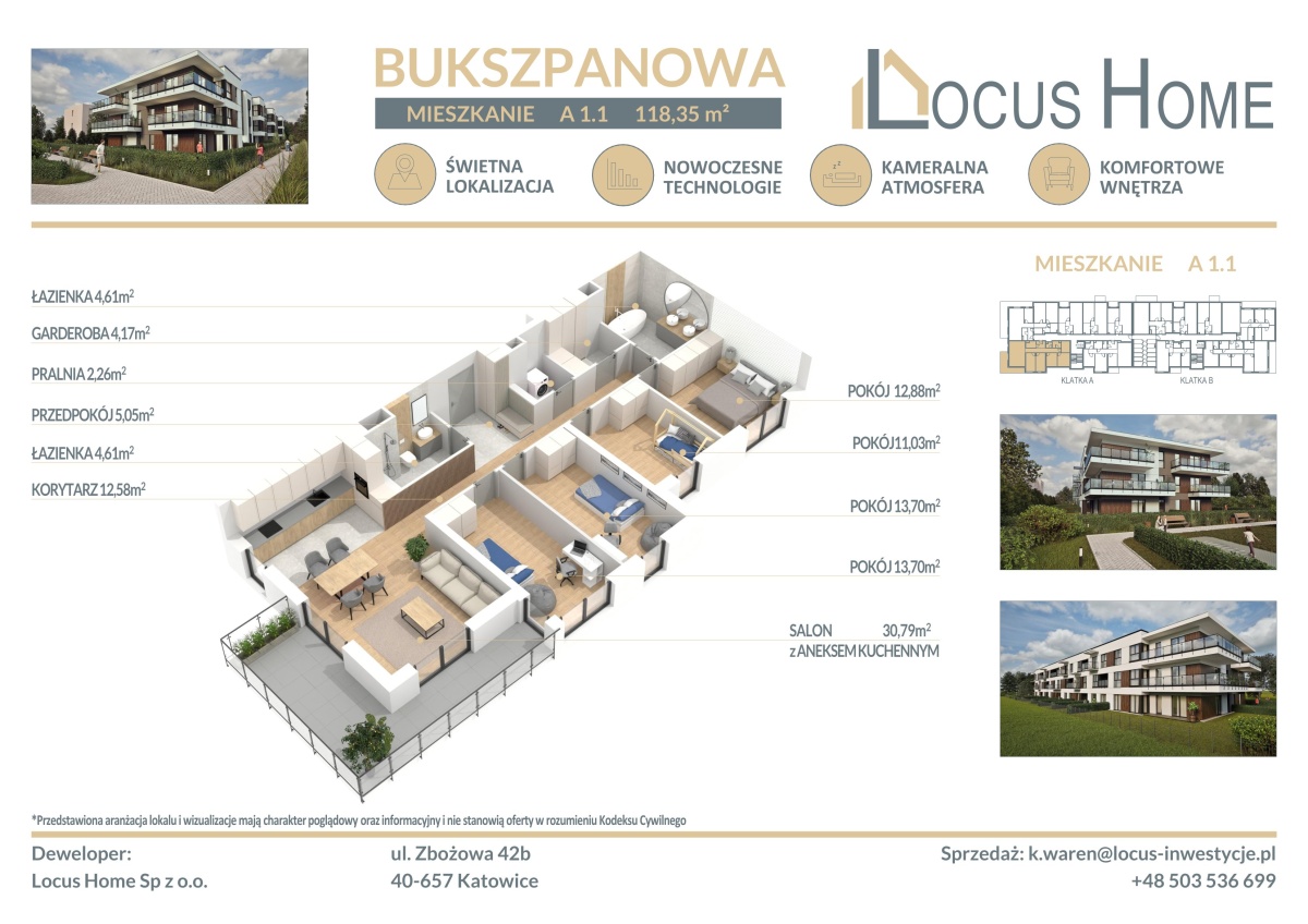 Spółka LOCUS HOME to DEWELOPER który realizuje inwestycje mieszkaniowe na terenie Katowic od wielu lat. NOWA inwestycja na ulicy BUKSZPANOWEJ (obok nr 19) w Piotrowicach to nowoczesny apartamentowiec w doskonałej lokalizacji Katowic.