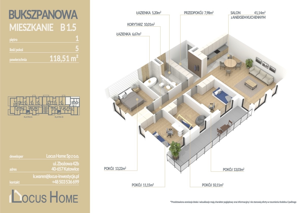 Przedstawiamy ofertę mieszkania 5 - pokojowego o powierzchni 118,51 m² z balkonem, zlokalizowanego na pierwszym piętrze budynku, oznaczonego nr B 1.5