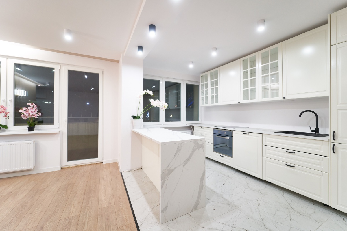 - kuchnia w zabudowie z wyspą wyposażona w piekarnik, płytę indukcyjną, lodówkę oraz zmywarkę